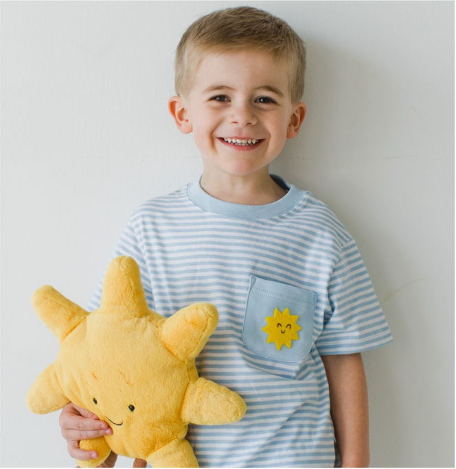 Soft blue knits, rainbow stripes, sunshine pockets, and cheerful appliqués — thoughtfully created to celebrate the colorful, joy-filled world of childhood.