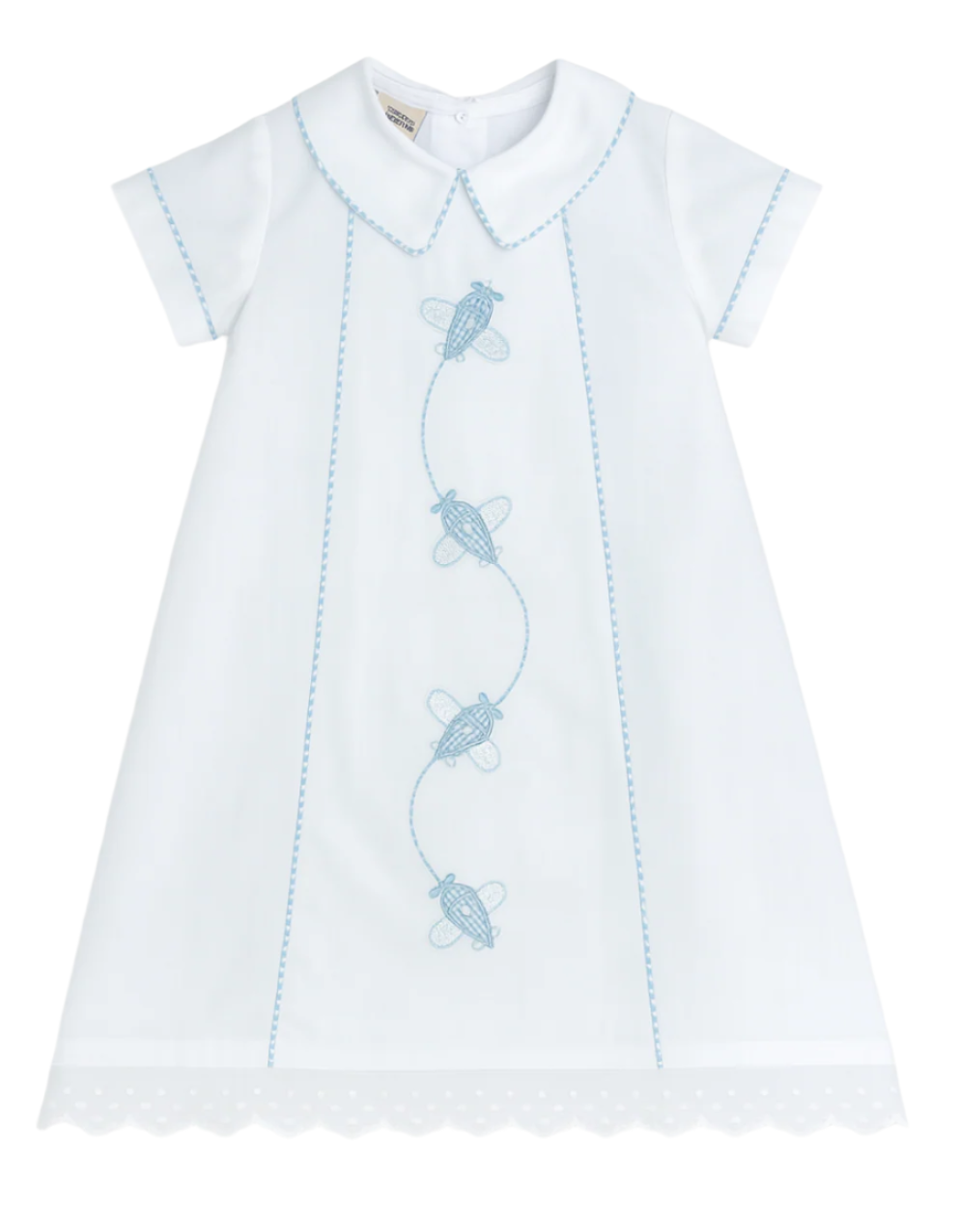 This charming long daygown features a delightful embroidered airplane down the front, adding a whimsical touch to bedtime. Finished with a sweet collar and delicate lace trim, it combines comfort and style for your little one’s cozy adventures. Perfect for dreamy days and peaceful nights!