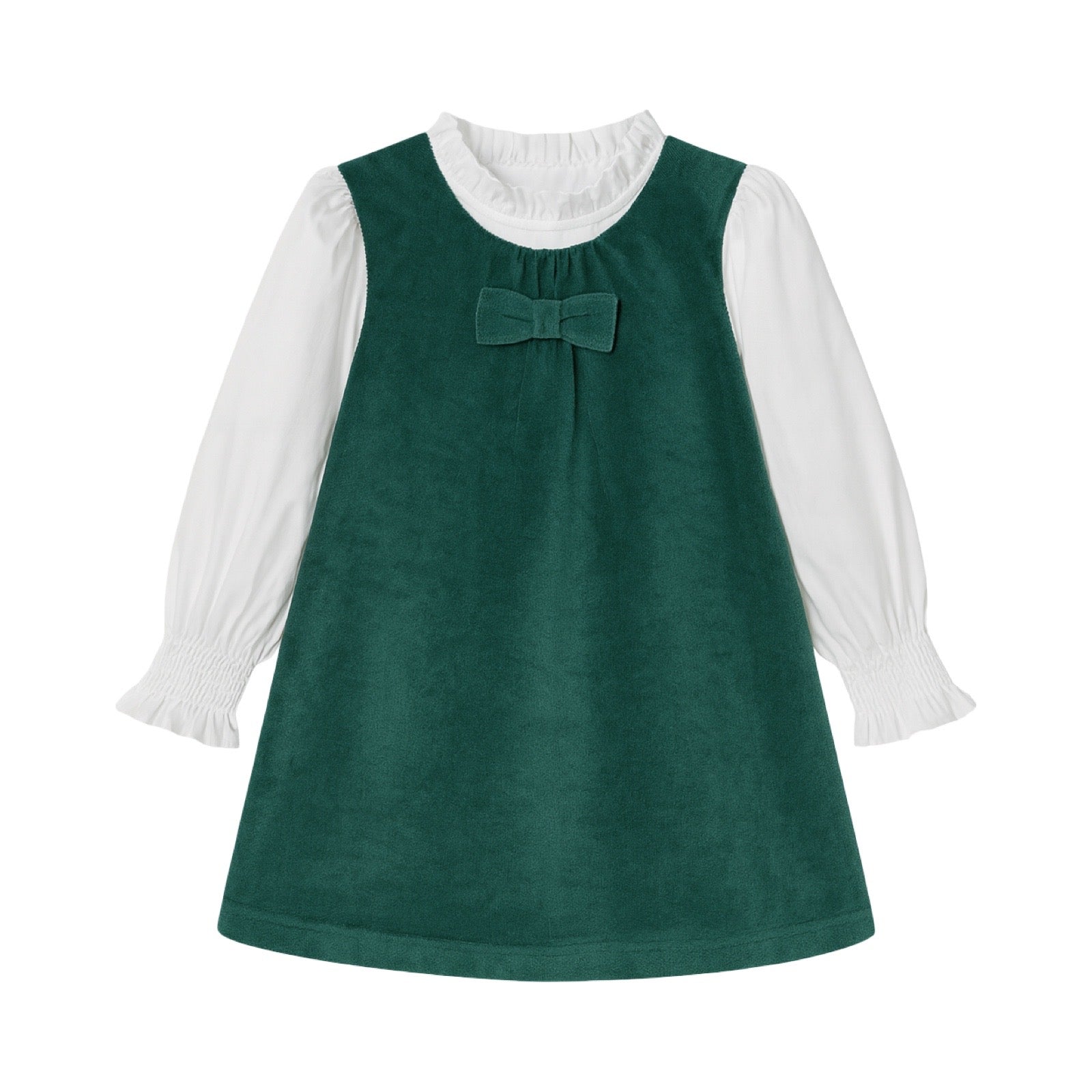This charming Amelia Velvet Dress Set features a lush green velvet sleeveless dress with an adorable bow detail, perfectly paired with a crisp white long sleeve blouse. The blouse shines on its own too, making it an easy favorite to mix and match with all her basics for endless playful outfit possibilities.
