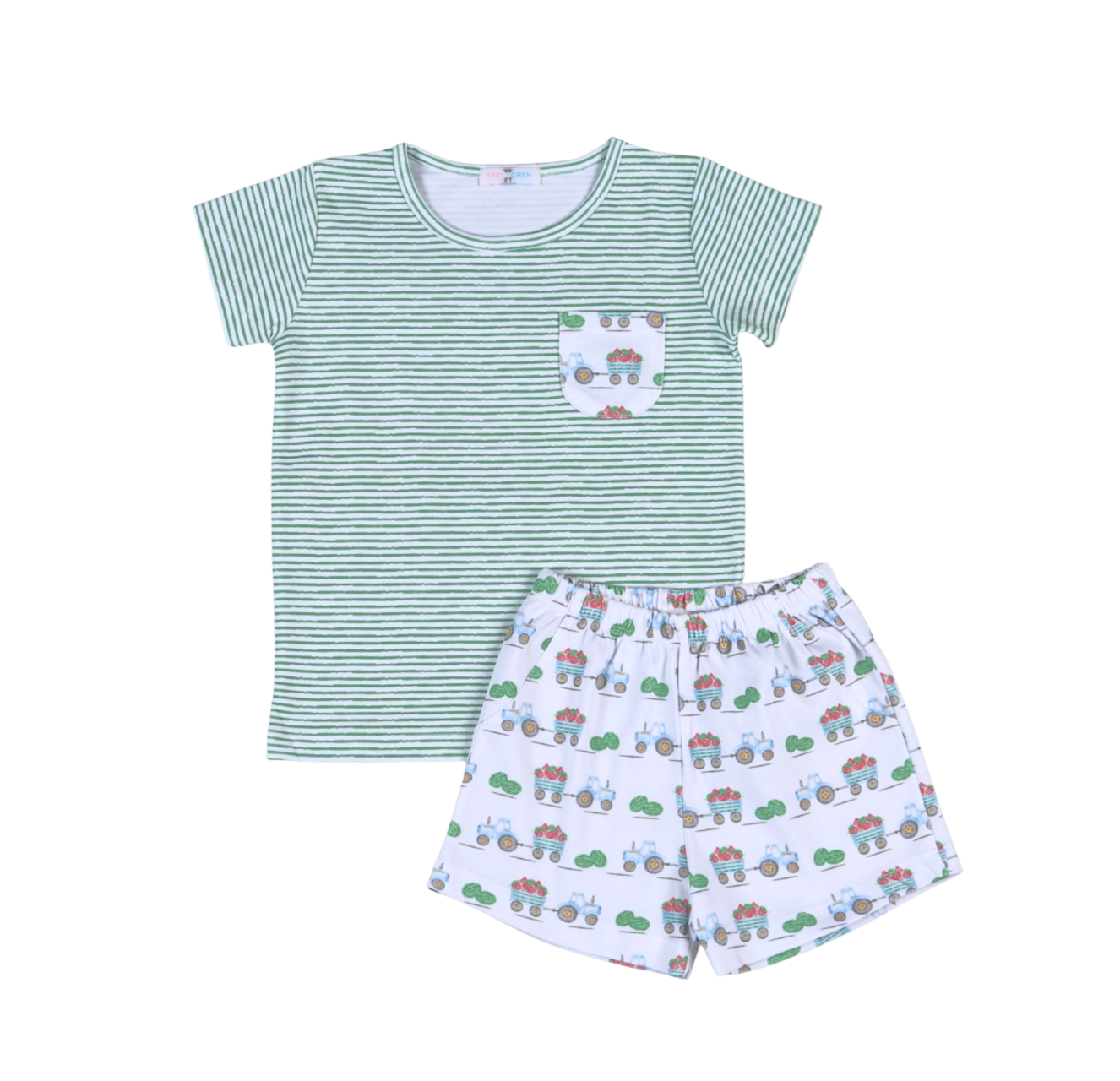 Little farmers will love this adorable short set featuring a cheerful tractor print paired with coordinating green striped shorts. The charming pocket detail adds extra character to this mix-and-match favorite. Perfect for playtime adventures, warm weather outings, or everyday wear that keeps kids comfortable and stylish. A must-have for any little one who loves tractors and outdoor fun!
