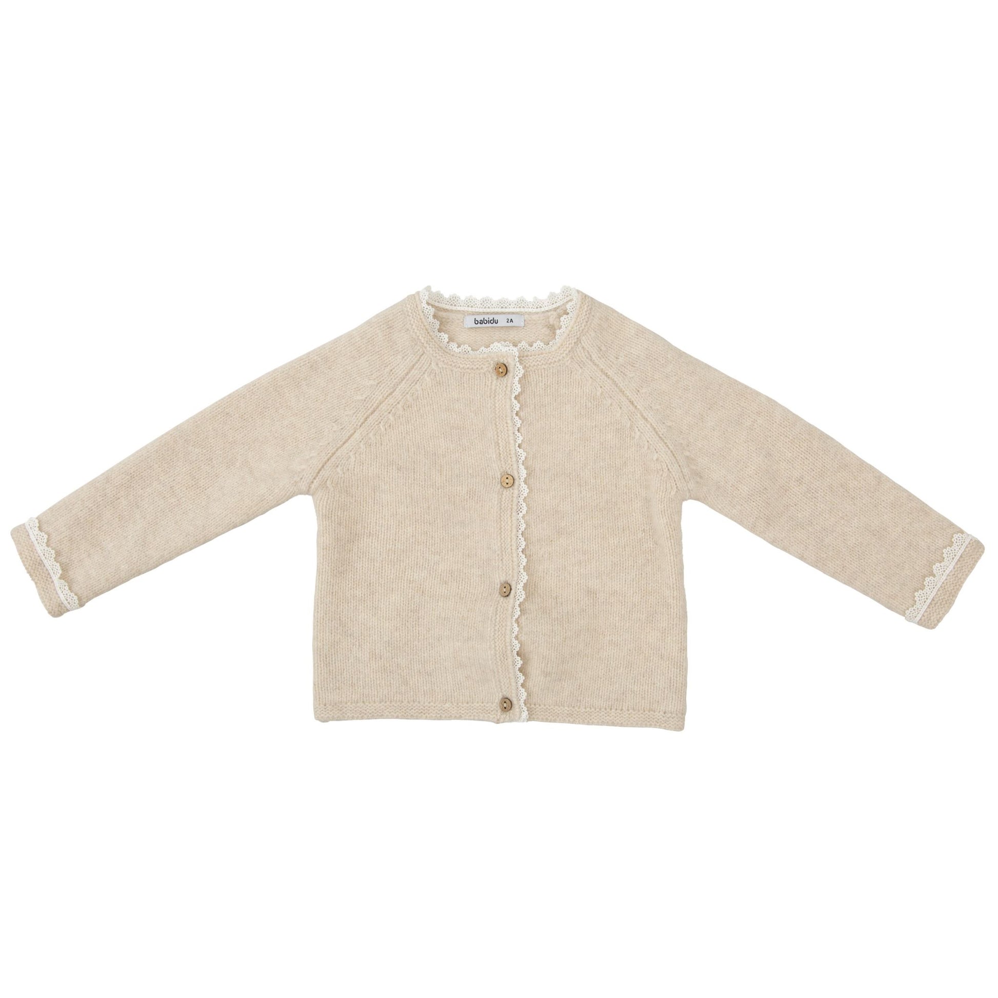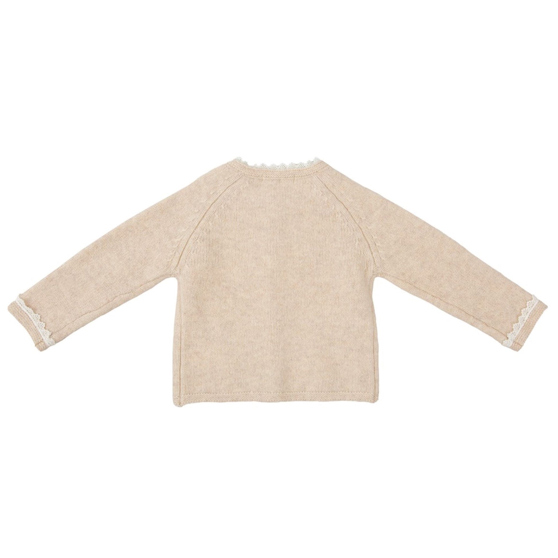 A warm and cozy staple that she can wear all season. This beige cardigan sweater has wooden buttons down the front and ivory lace trim.