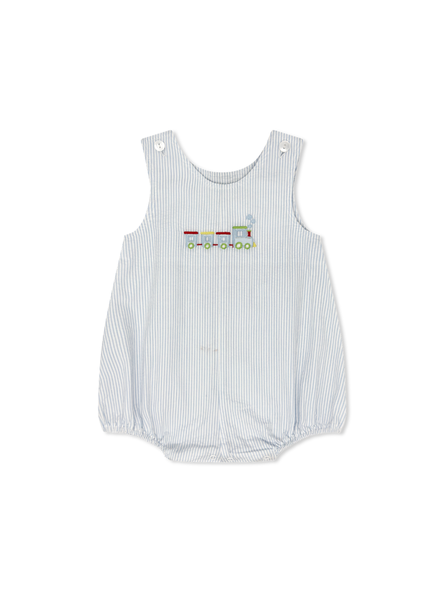 Choo-choo! This charming blue seersucker bubble features a delightful train applique that'll have little ones grinning from ear to ear. The classic seersucker texture adds texture and breathability, while the playful design makes getting dressed an adventure. Perfect for playdates, family gatherings, or everyday fun. Sweet, simple, and oh-so-adorable.