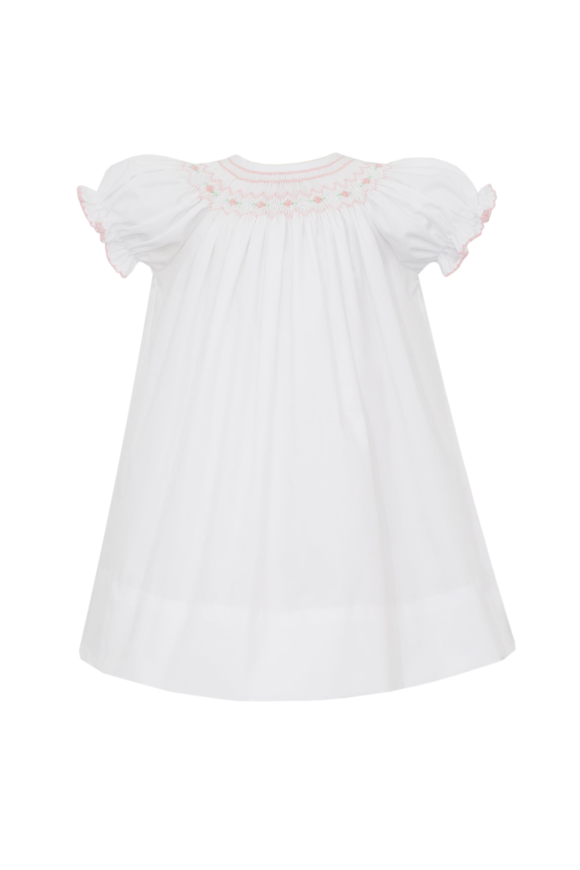 Your little angel will be ready for those spring and summer special occasions in this short sleeve dress. This sweet, special piece is crafted with white poplin fabric and highlighted with thoughtful details like a bishop collar smocked with the sweetest pink rosettes.