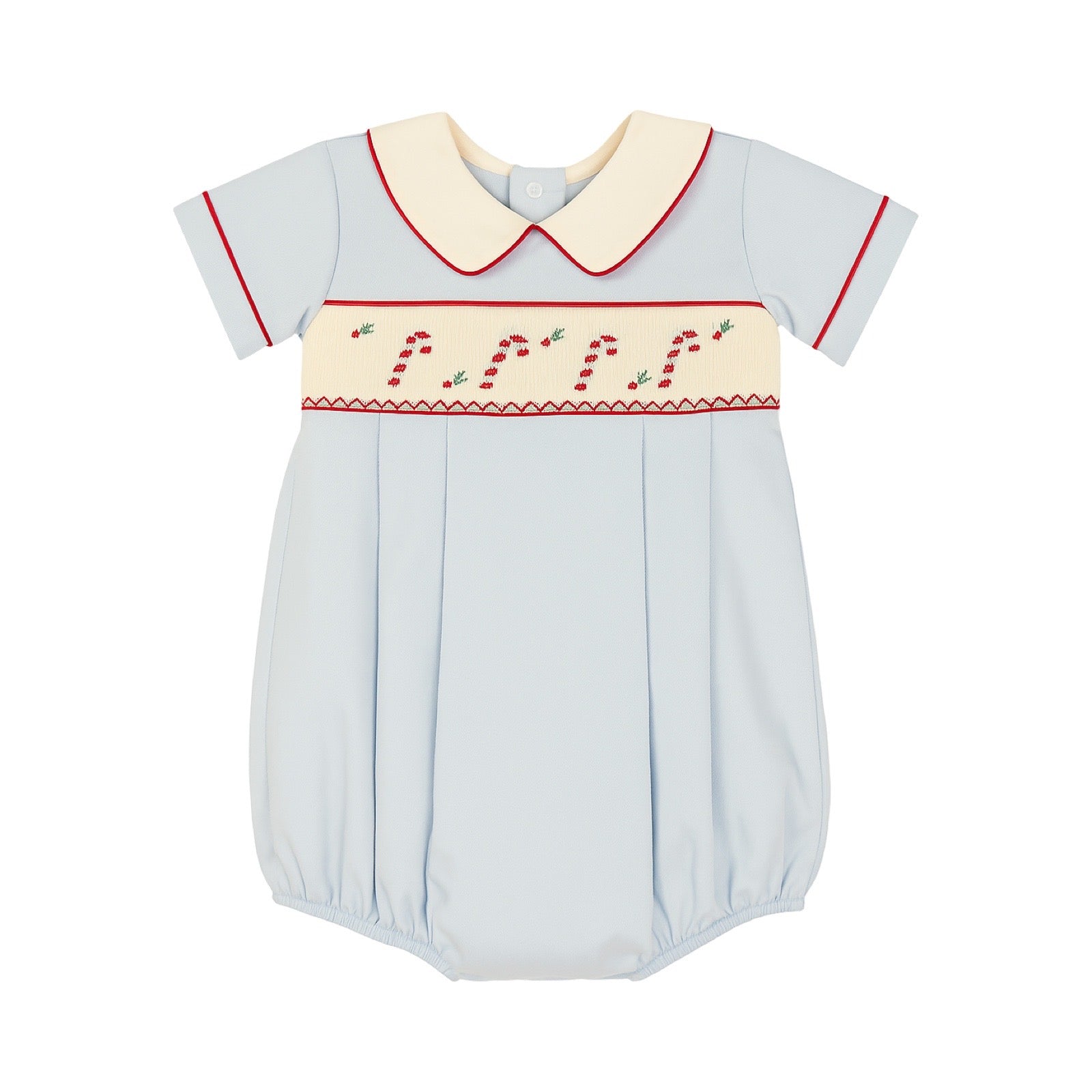 This charming shirt-sleeve Blake Bubble features delightful red piping details and playful smocked candy canes that add festive cheer. Designed with snaps at the legs and buttons at the back, it ensures easy dressing and diaper changes while keeping your little one cozy and stylish. Perfect for holiday fun with a touch of classic charm!