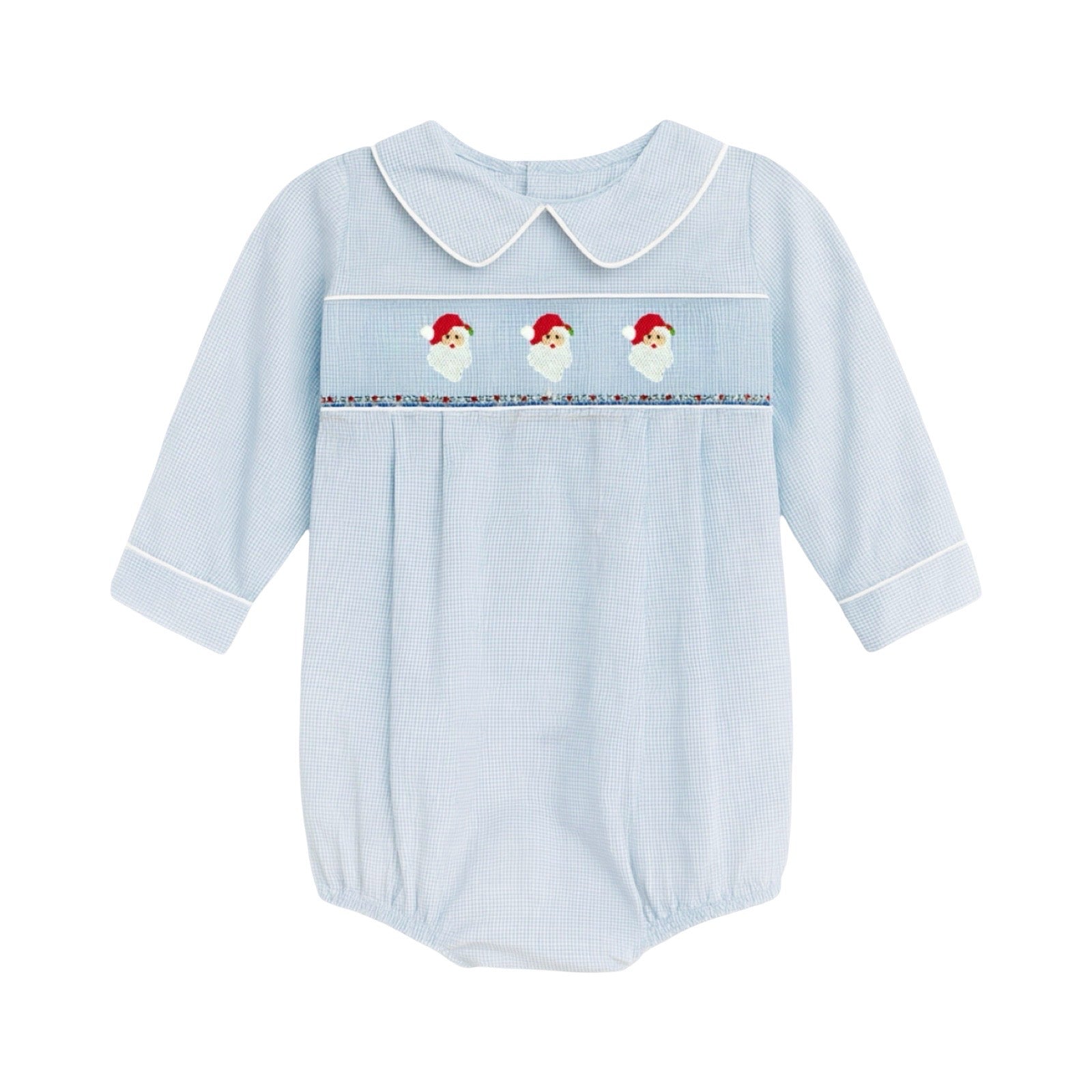 This charming long-sleeve Blake Bubble features delightful white piping details and playful smocked Santas that add festive cheer. Designed with snaps at the legs and buttons at the back, it ensures easy dressing and diaper changes while keeping your little one cozy and stylish. Perfect for holiday fun with a touch of classic charm!