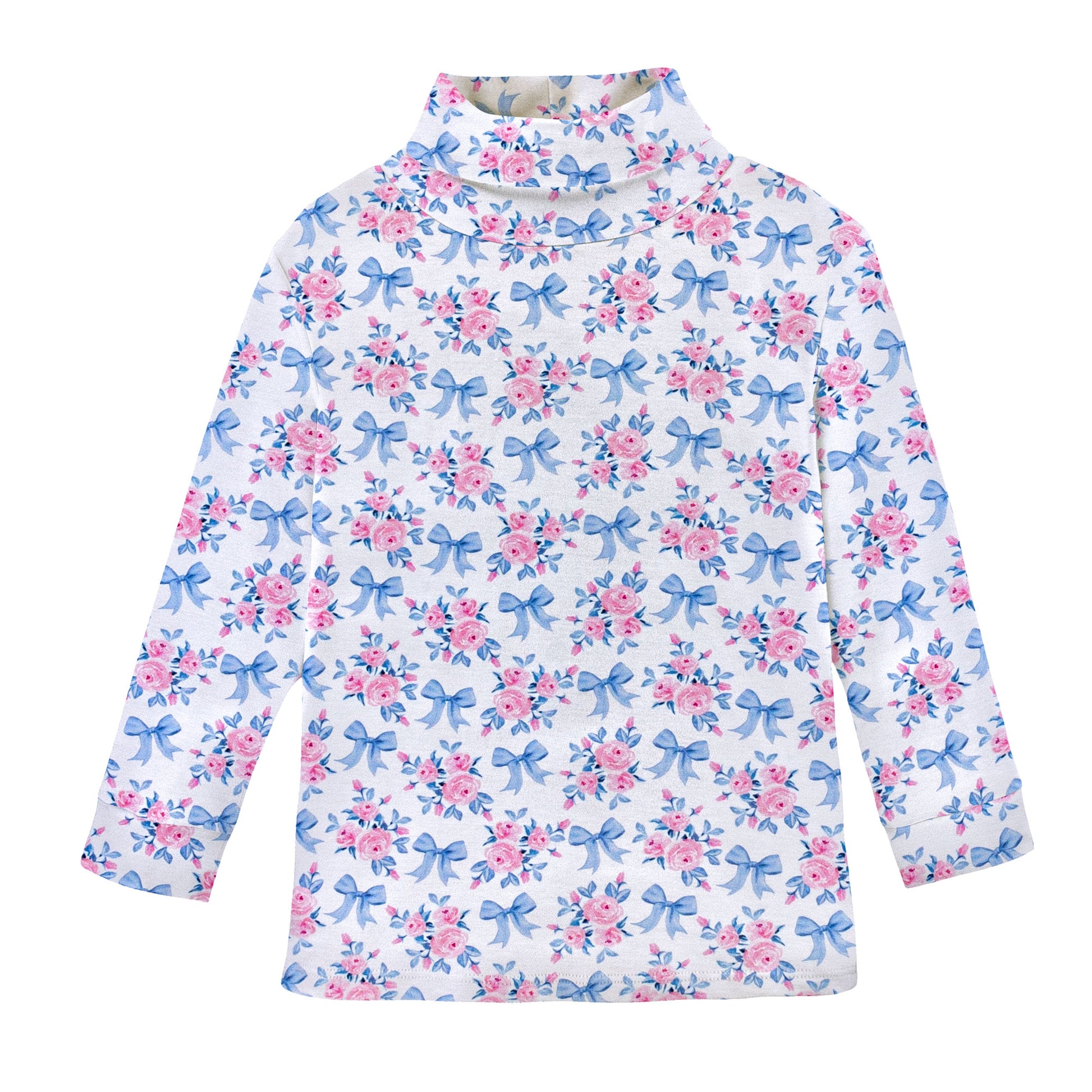 This charming blue turtleneck features a delightful bow print that adds a touch of whimsy to any outfit. Soft and cozy, it’s perfect for keeping your little girl warm while showcasing her playful style. Ideal for layering or wearing on its own, this top brings a fun, floral-inspired twist to everyday wear.