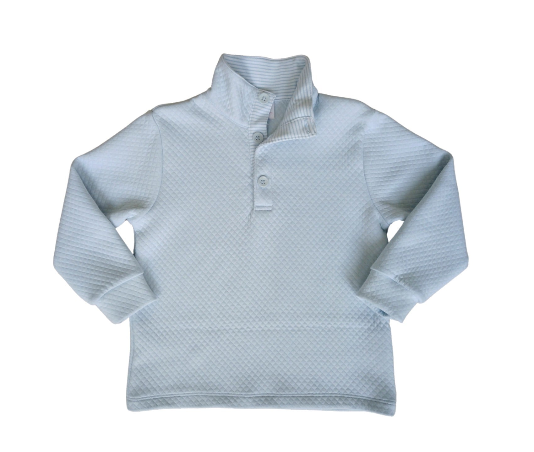 Dress up your little boy in style with our Blue Quilted Pullover! This handsome and cozy pullover features a button closure and a blue stripe detail on the collar. Perfect for a stylish and chilly day out. Get ready for some double takes!