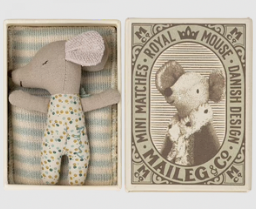 A classic Maileg item. This mouse is ready for hours of play and sleeps tight in the little matchbox. The clothes and bedlinen are made of soft fabrics with unique prints and beautiful colors.