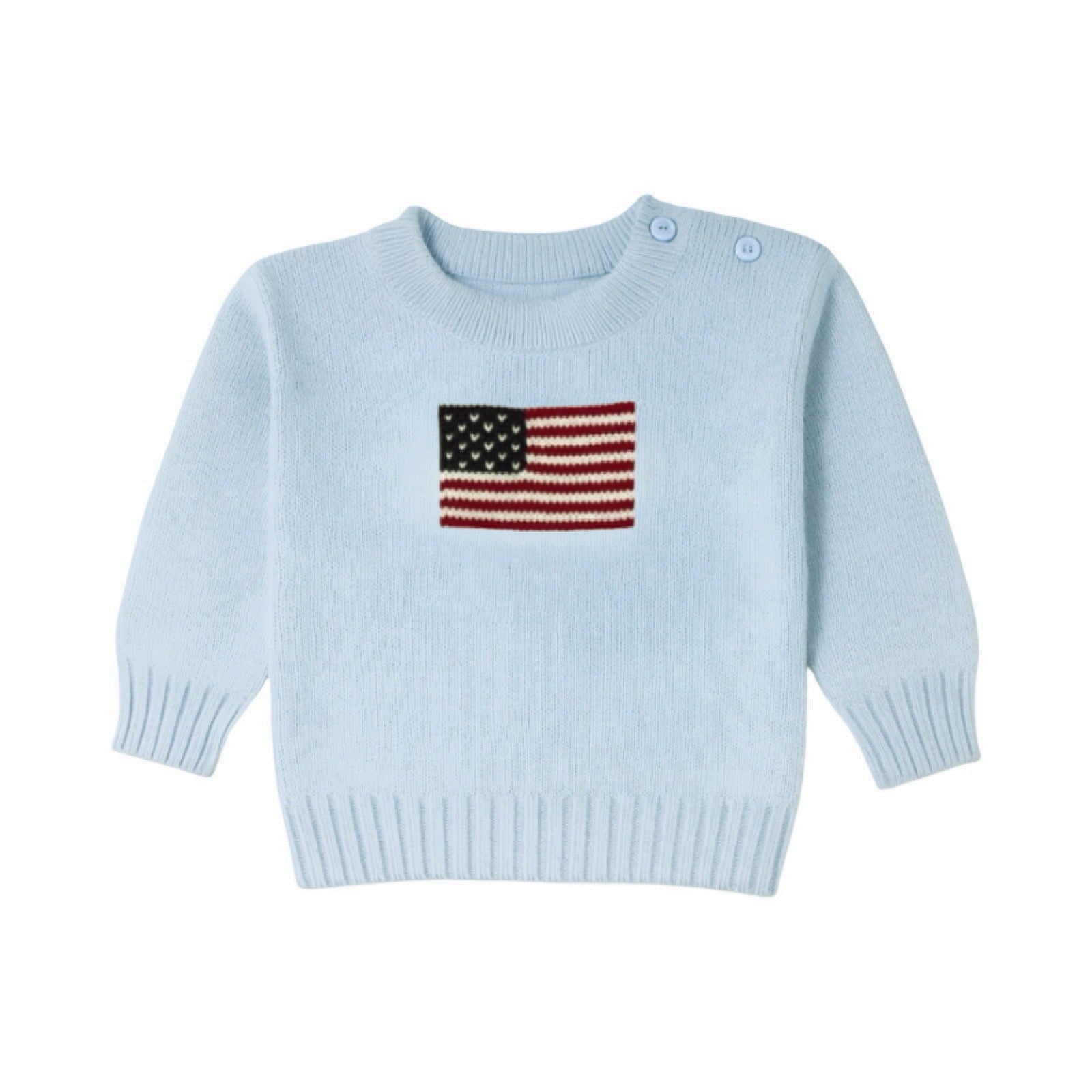 Add a pop of patriotic style to your little guy's wardrobe with our Antique Flag blue Crew Neck Sweater. Featuring a vintage-inspired red, white, and blue flag design on a soft light blue sweater, this piece is perfect for any occasion. With 3 buttons at the shoulder, getting dressed has never been easier! (No more sweater struggles!)