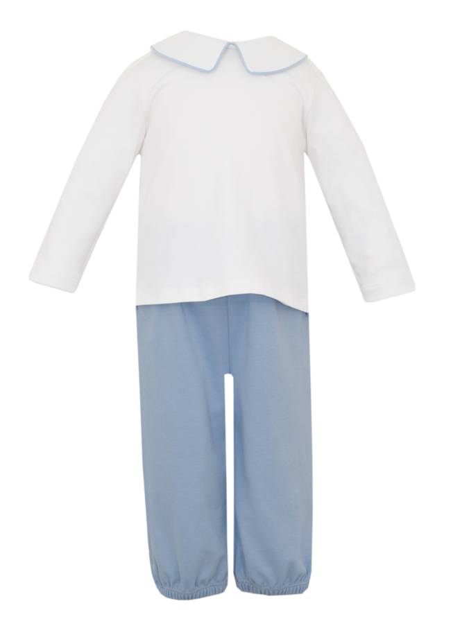 This two piece set includes a long sleeve collared white knit shirt with light blue piping trim paired with light blue knit pants