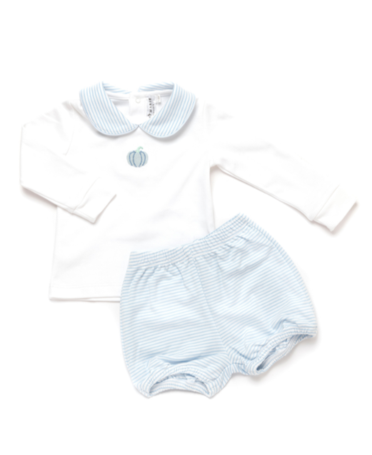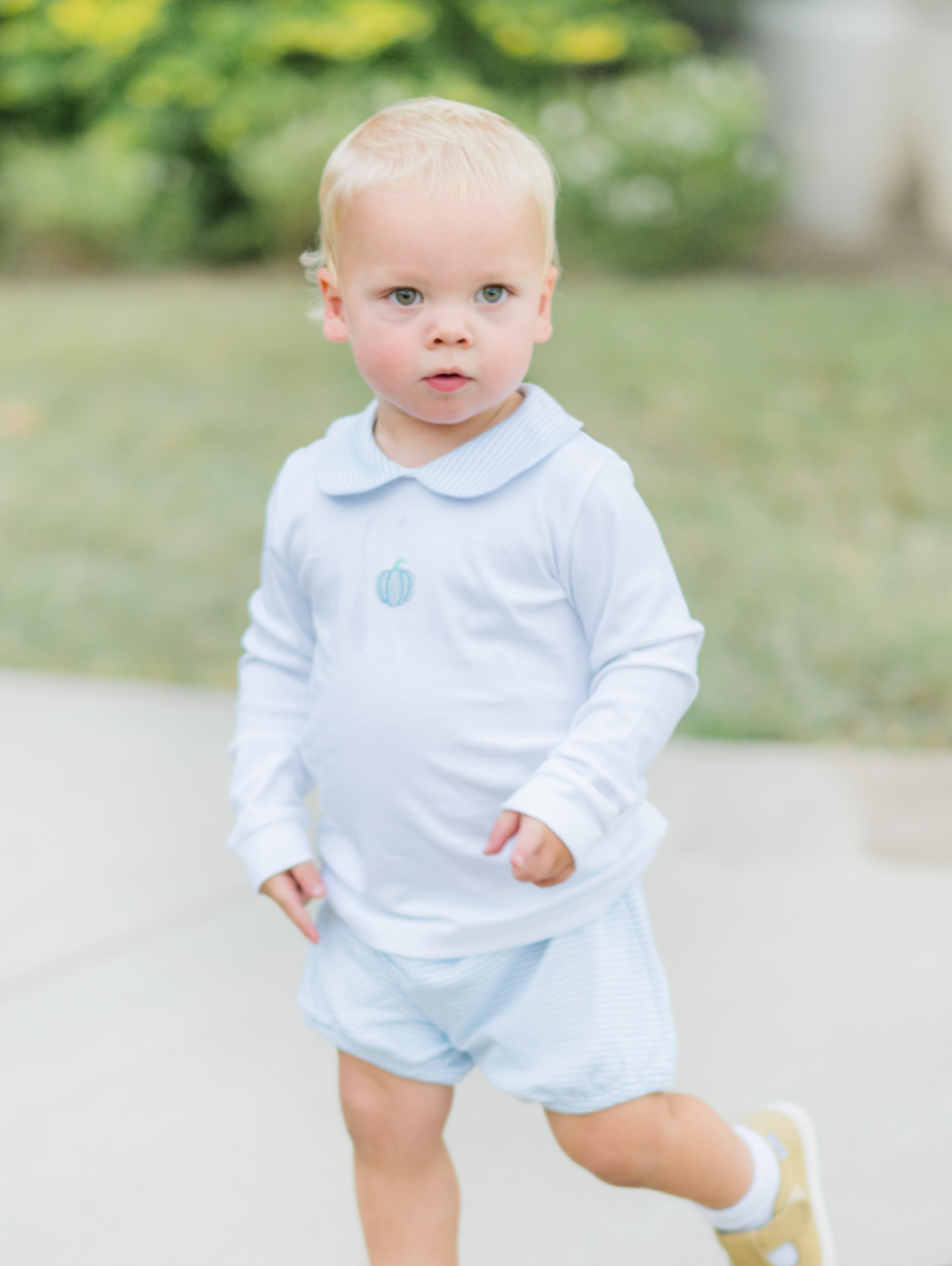 A sweet two piece set for your little boy this fall. A long sleeve white top with a blue stripe collar and matching blue stripe bottoms. A French knot blue pumpkin is embroidered on the chest.