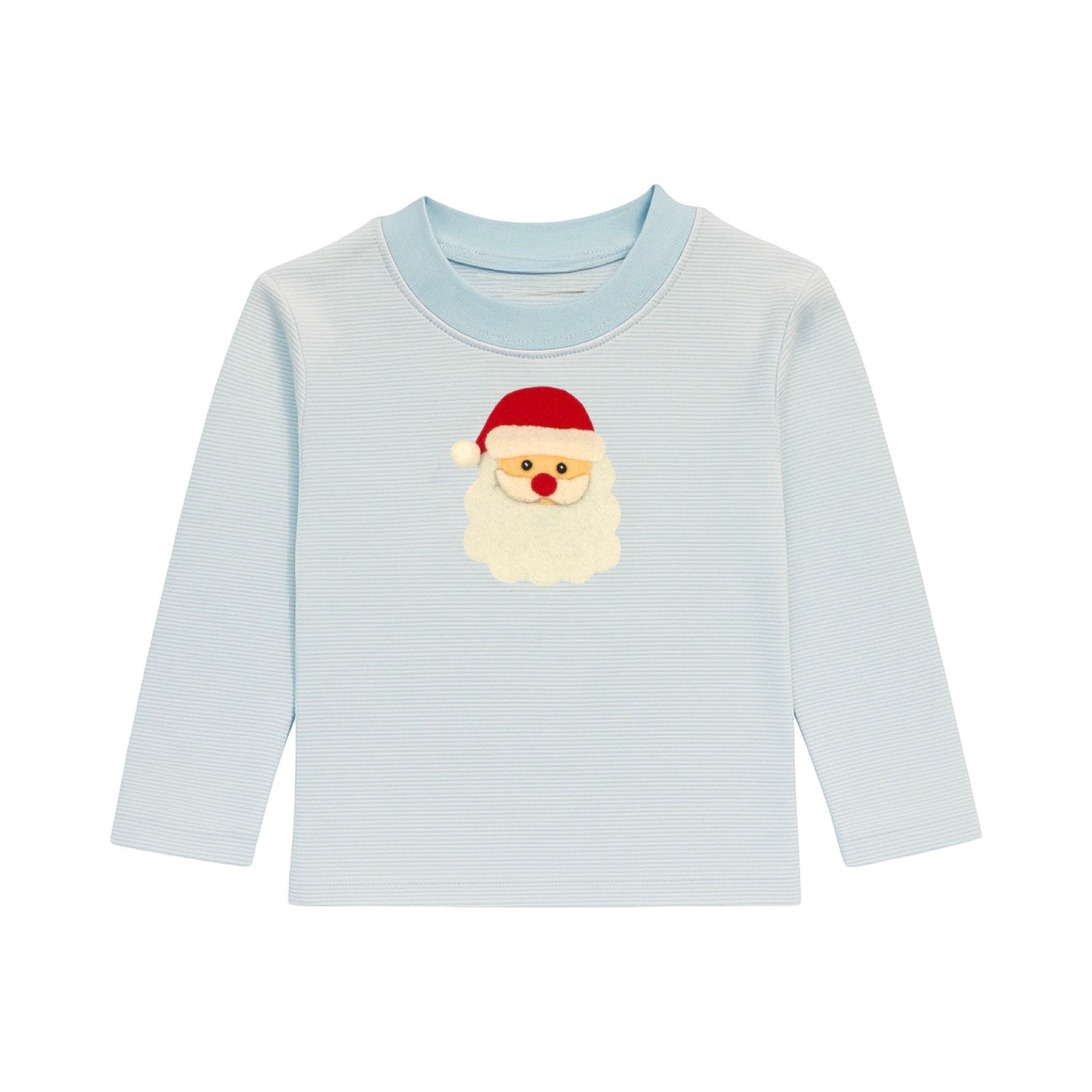 This charming long sleeve tee features a classic baby blue and white mini stripe pattern with a delightful Santa applique that brings festive cheer to your little one's wardrobe. Perfect for holiday celebrations or cozy winter days, the soft knit fabric keeps him comfortable while the cheerful design captures that magical season spirit. An adorable essential that pairs easily with his favorite pants or shorts!