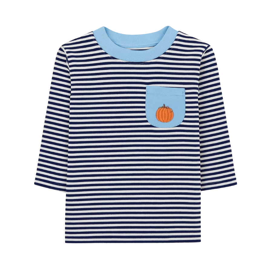 Brighten up any day with this playful long sleeve tee featuring classic royal blue and white stripes. The light blue crewneck and pocket add a fun contrast, while the charming pumpkin embroidery brings a touch of seasonal cheer. Perfect for cozy adventures, this shirt combines comfort with a dash of whimsy.