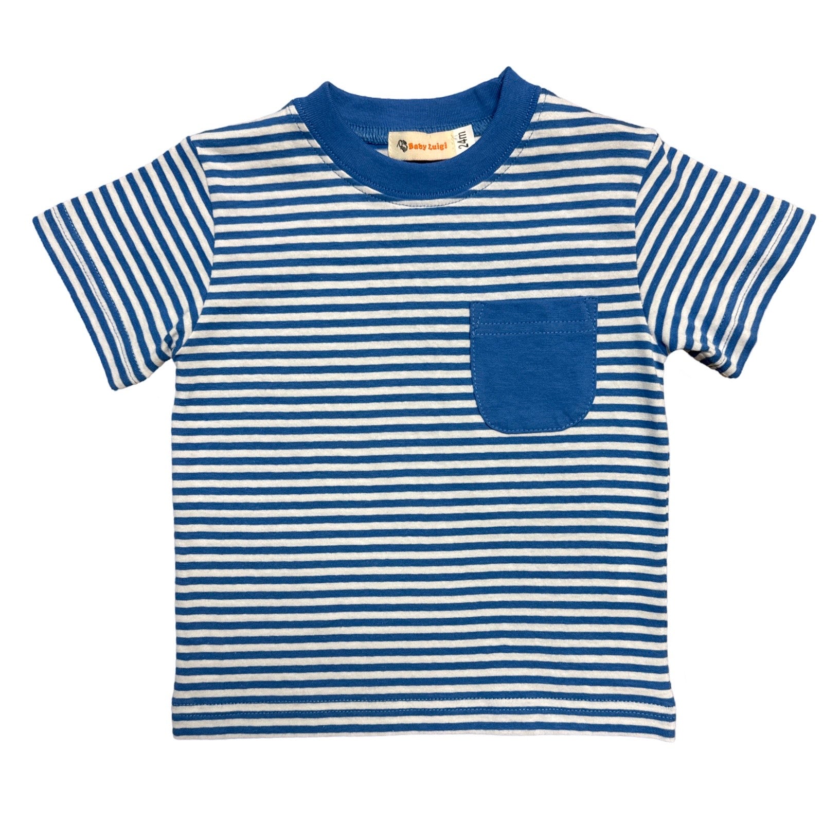 A perfect basic shirt for all his adventures. Short sleeve striped ocean blue t-shirt with a solid ocean blue pocket and neck trim.