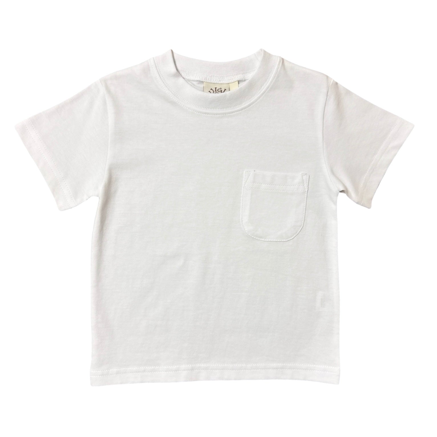 A perfect basic shirt for all his adventures. Short sleeve white t-shirt with a white pocket and neck trim.