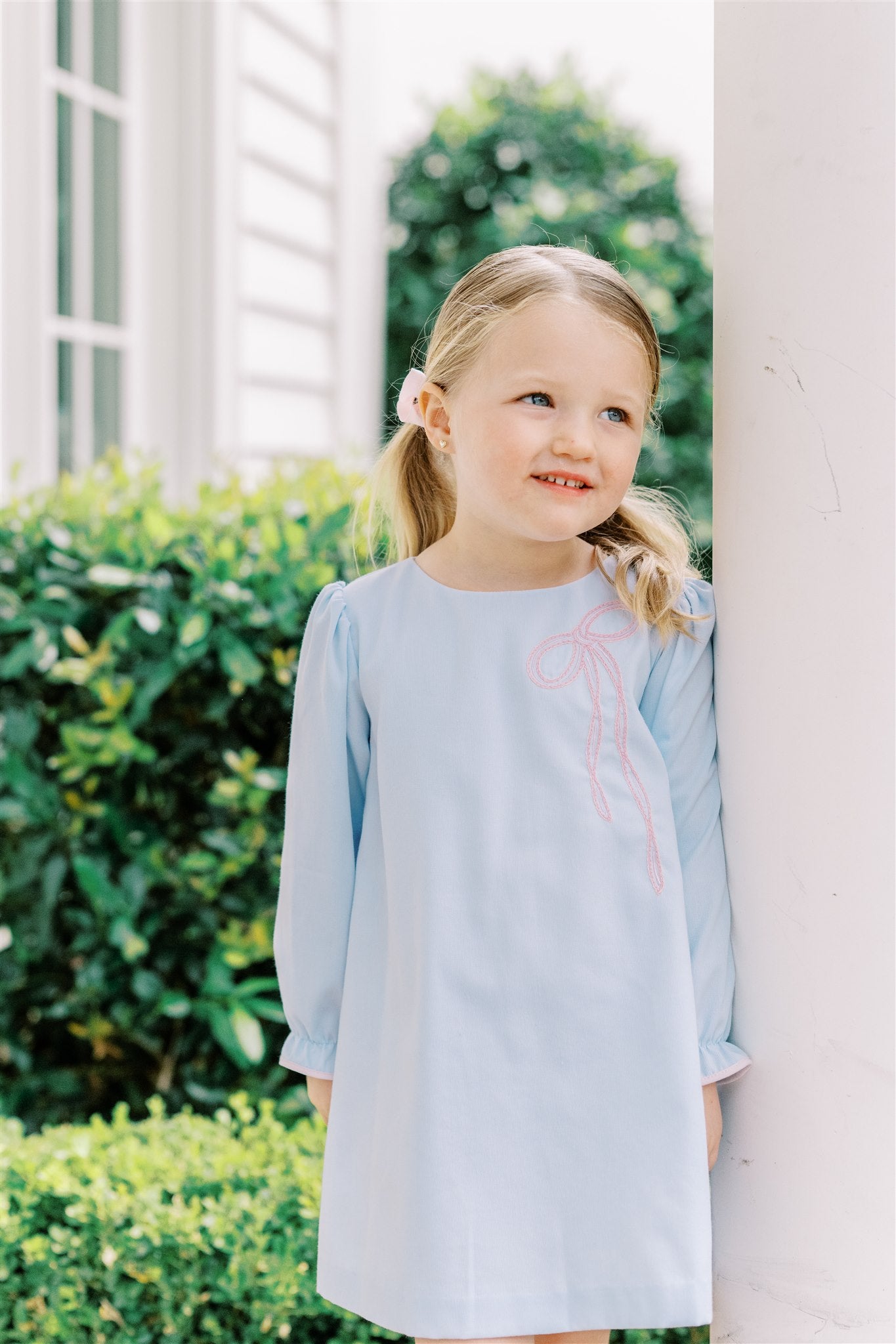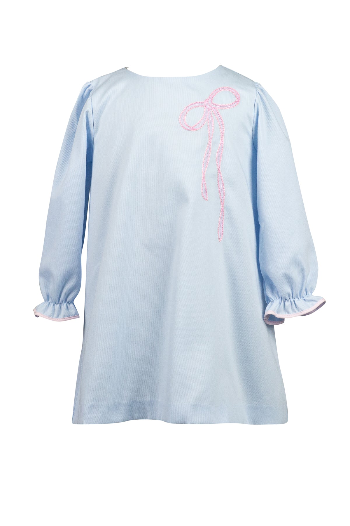 This adorable light blue woven shift dress features a charming light pink bow on the left chest and delicate pink trim gathered at the sleeves. Designed for comfort and cuteness, it’s the perfect outfit for your little one’s sweet fall moments. Coordinates perfectly with the Brooklyn Bow Bubble.