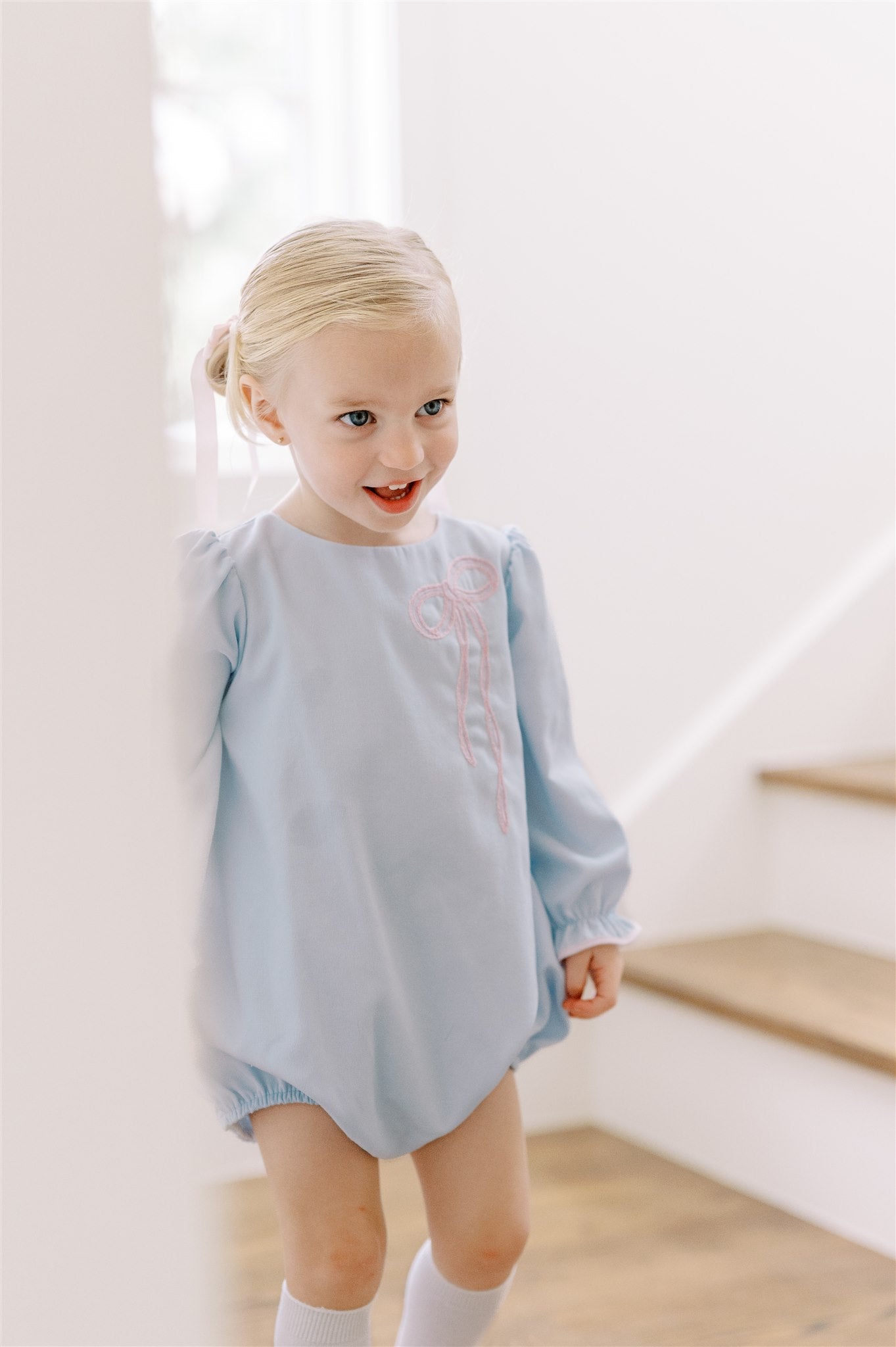 This adorable light blue woven bubble features a charming light pink bow on the left chest and delicate pink trim gathered at the sleeves. Designed for comfort and cuteness, it’s the perfect outfit for your little one’s sweet fall moments. Coordinates perfectly with the Brooklyn Bow Dress.