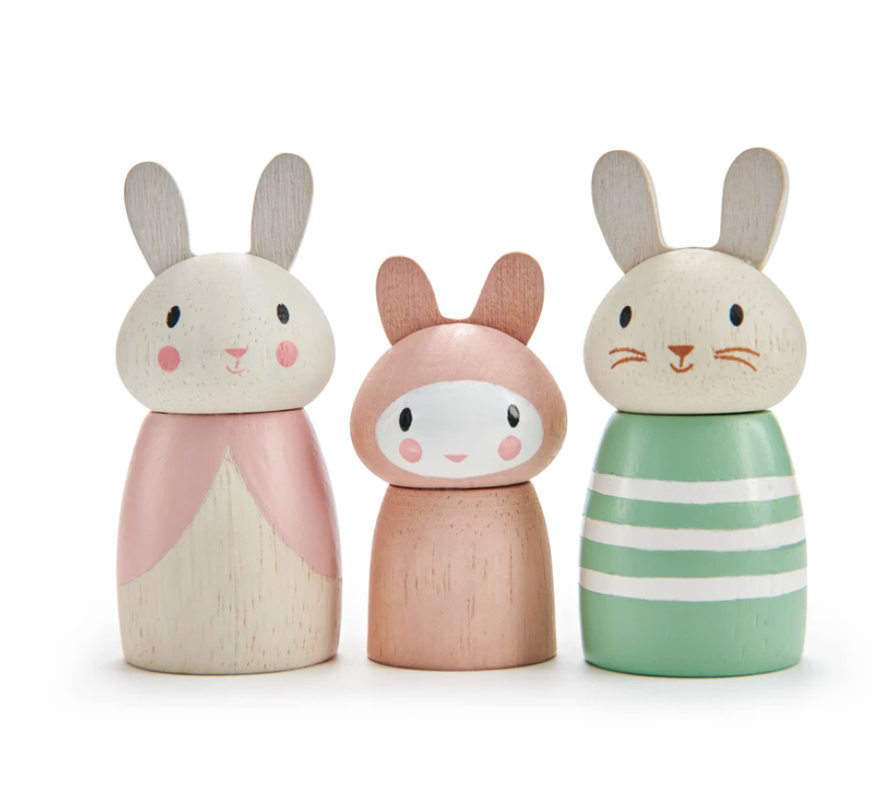 A perfect solid bunny family with Dotty the mum, Benny the dad and Pip the baby, all finished in stylish colors and ready to add to any dolls house set or open-ended play set.