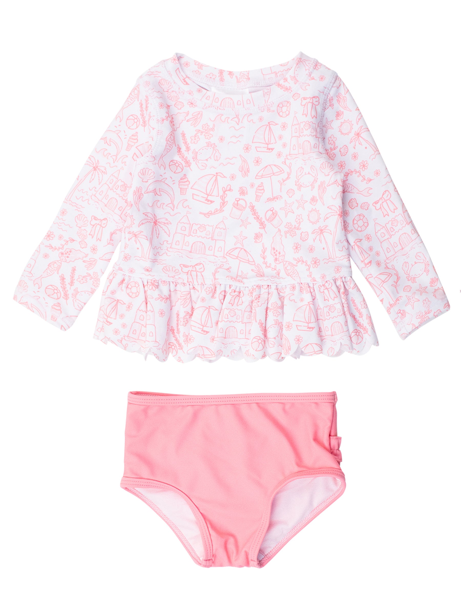 Looking to add style and flair? You will definitely love this scalloped ruffle long sleeve 2 piece rash guard as a perfect summer swimsuit for your little mermaid. Keep her protected all day from the sun with UPF 50+ sun protected fabric for a playful and fun day in the water.