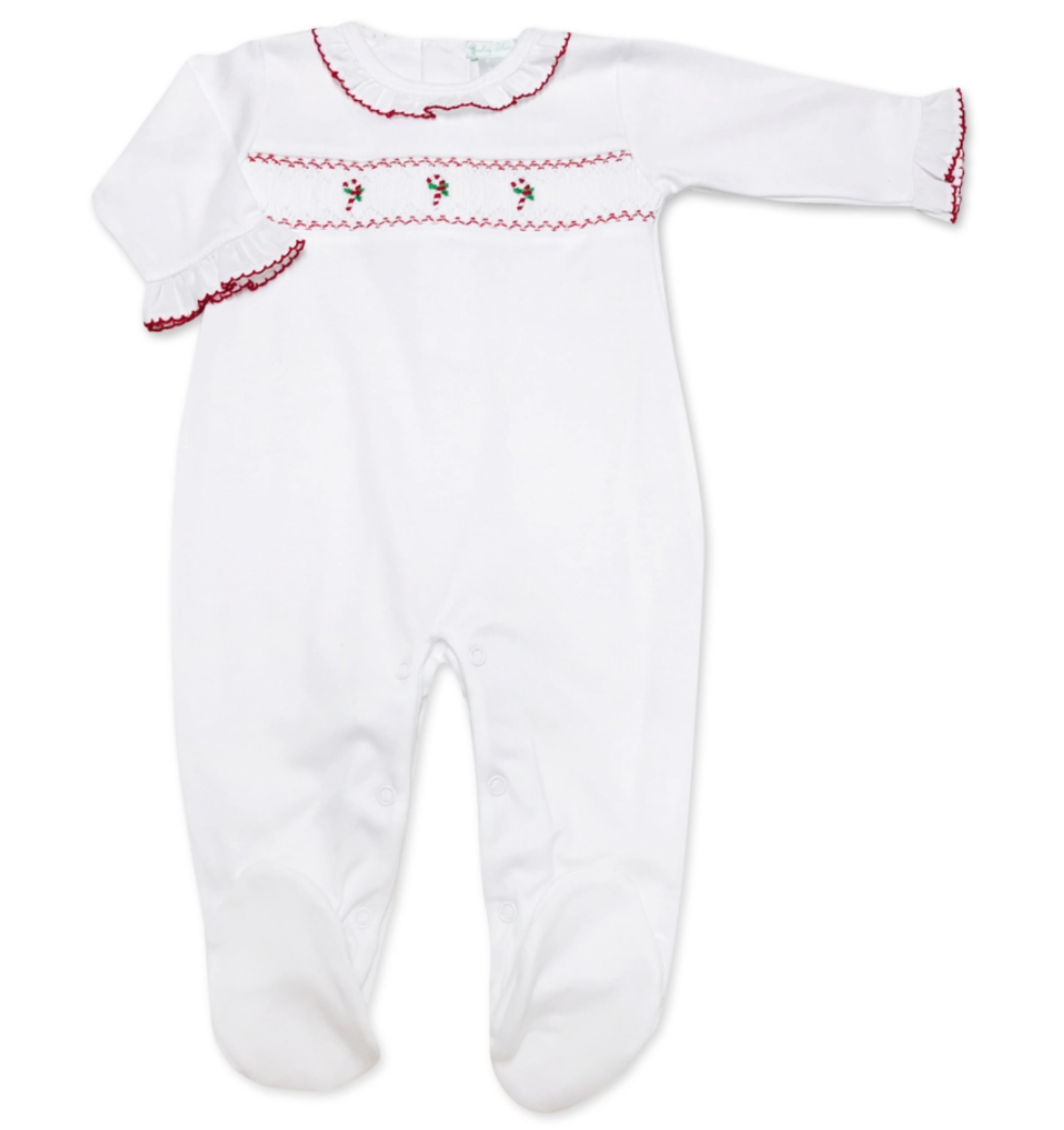 This oh so sweet footie with smocked candy cane detailing and ruffle neckline and wrists is perfect for their first holiday season. Add a matching bib and blanket for a beautiful gift.
