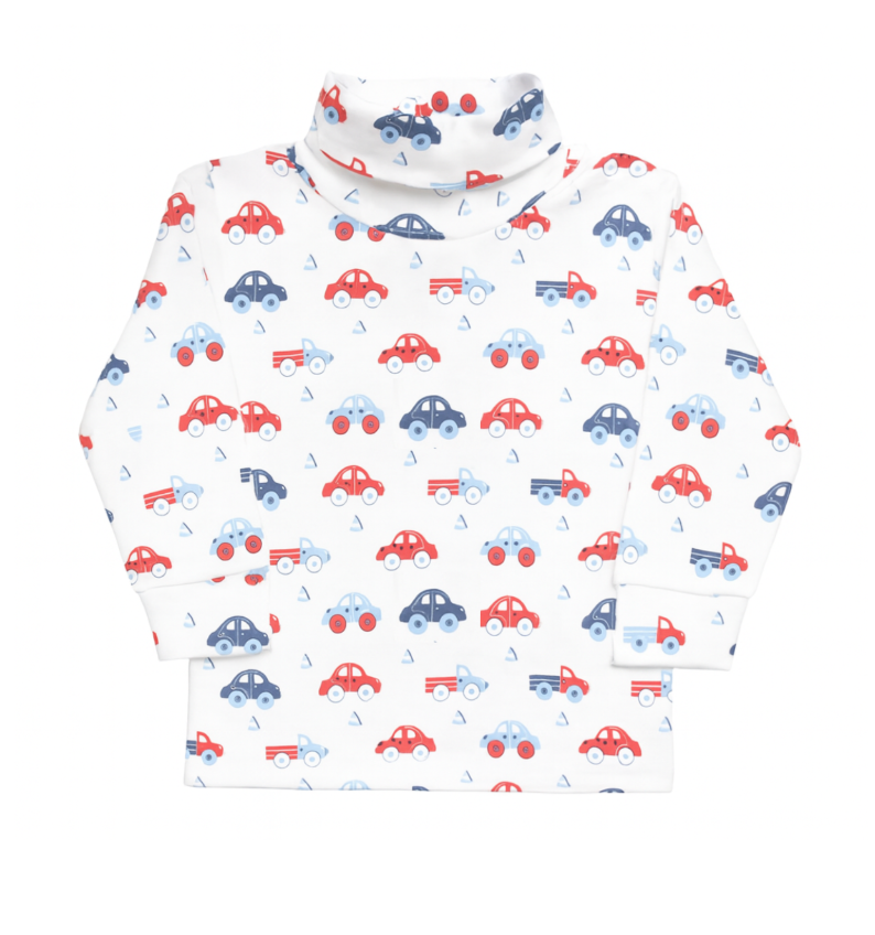 Keep your little one cozy and stylish with this playful cotton turtleneck featuring a vibrant red and blue cars and trucks print. Soft and comfortable, it's perfect for active days and adds a fun, colorful touch to any outfit.