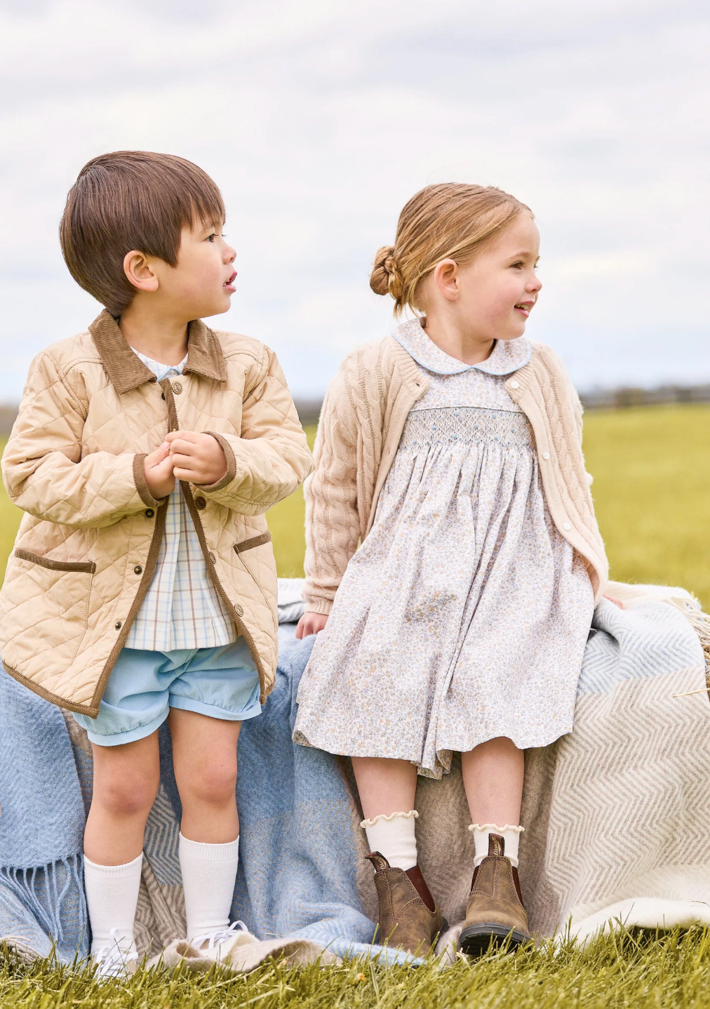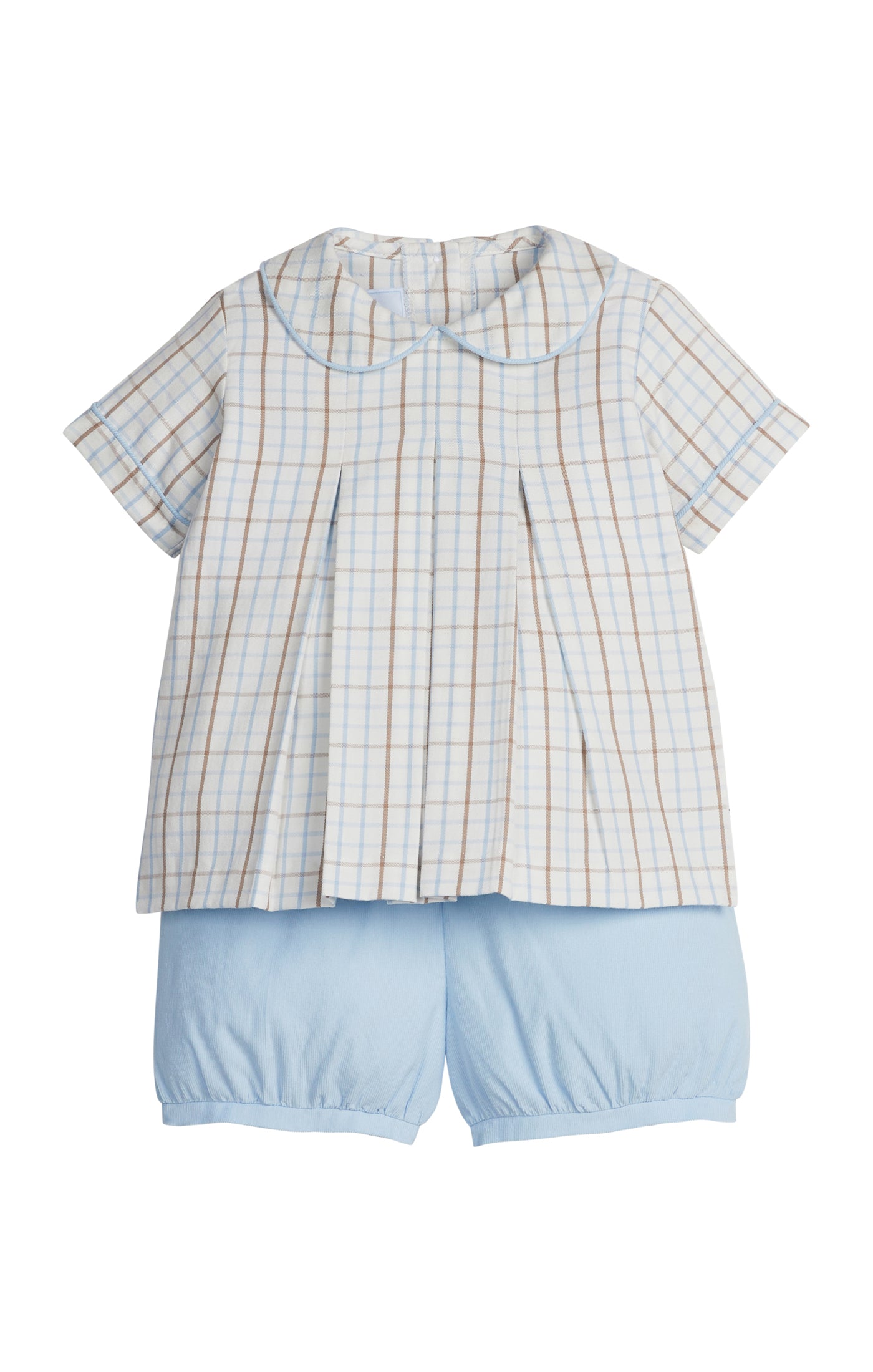 Our Carson Short Set in Winthrop Plaid is an elevated choice for little boys. The short sleeve peter pan shirt features dart pleats in front and light blue corduroy piping at the collar and sleeves that coordinates back to the banded shorts in light blue corduroy. With its muted blue and brown hues, this timeless collection is perfect for family photos and special occasions.