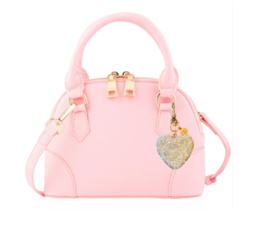 Charlotte is made of pebbled pale pleather with gorgeous chunky gold hardware, hand-sewn details, two inside pockets and adjustable matching cross-body strap. This version is extra special with an attached crystal heart charm. Charlotte is one she will carry all the time and hopefully for many years to come!