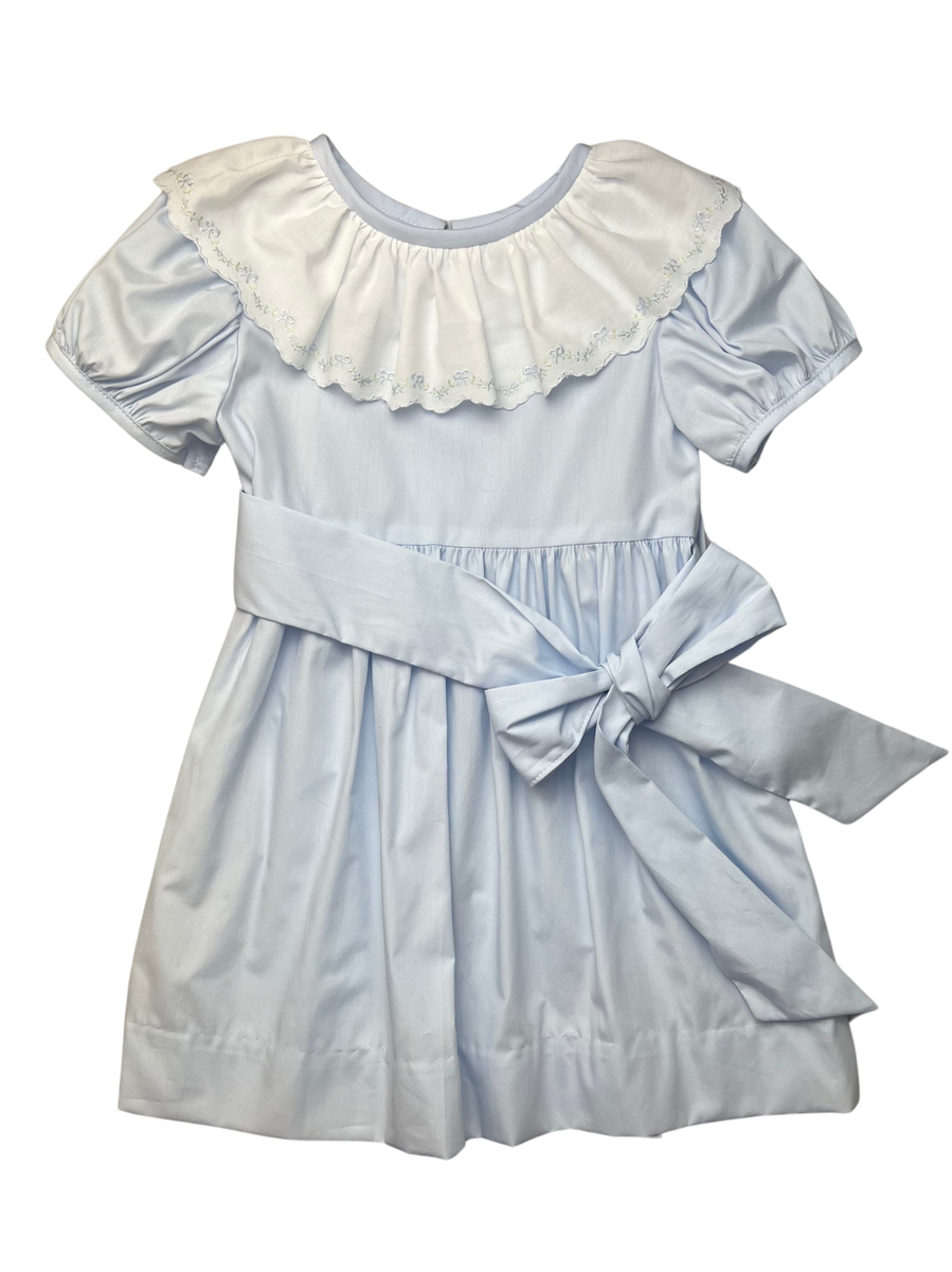 This darling little dress is perfect for spring pictures and Easter events. A soft blue short sleeve dress with a sash that ties into a big bow and a large white ruffle around the neckline with dainty blue bows embroidered along the scalloped edge.