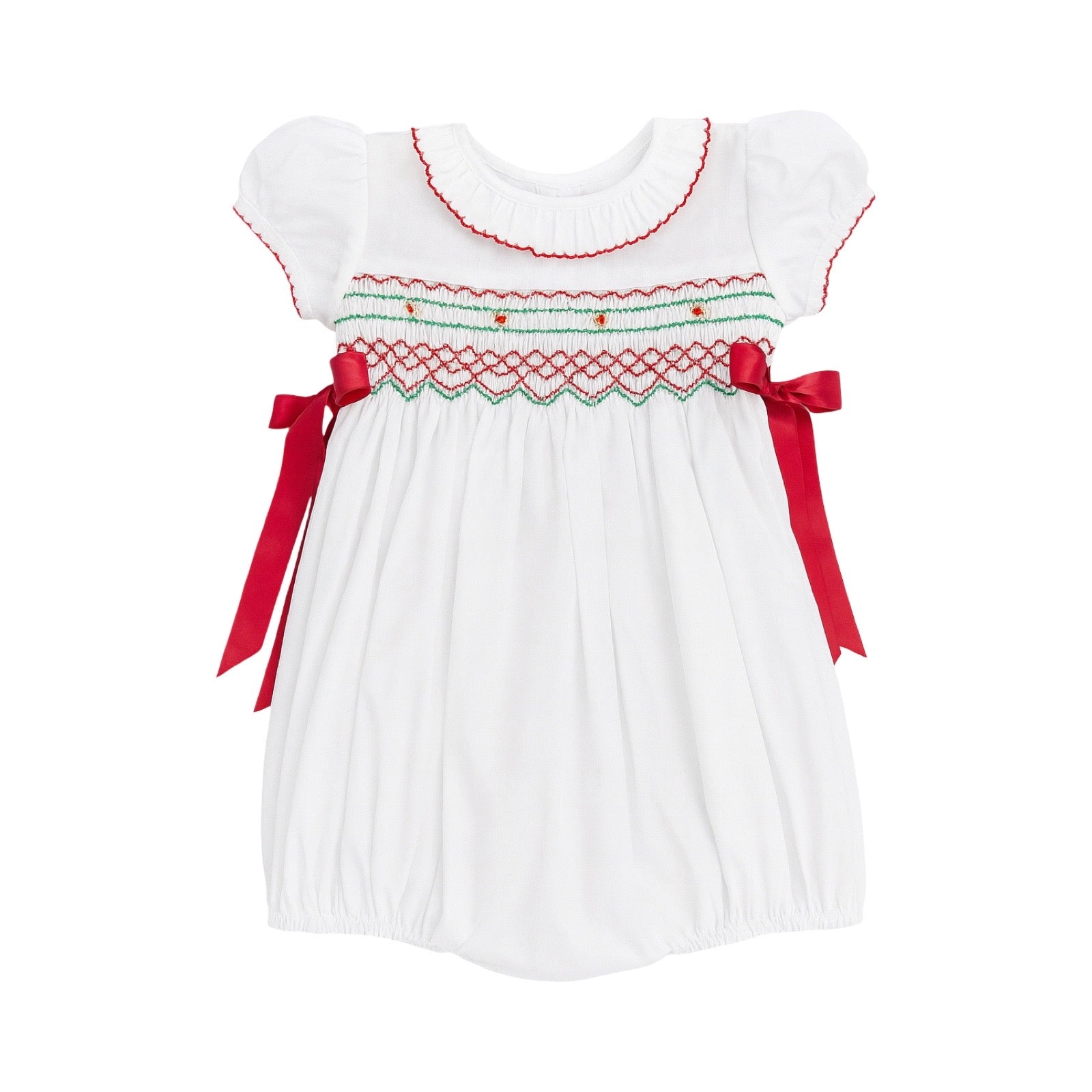 This charming white woven smocked bubble is a delightful holiday favorite, bursting with playful details. Featuring intricate smocking, a ruffled neckline, and festive satin red bows, it adds a touch of classic charm to your little one's Christmas look. The side ties ensure a comfortable fit, making this bubble as cozy as it is cute for festive celebrations.