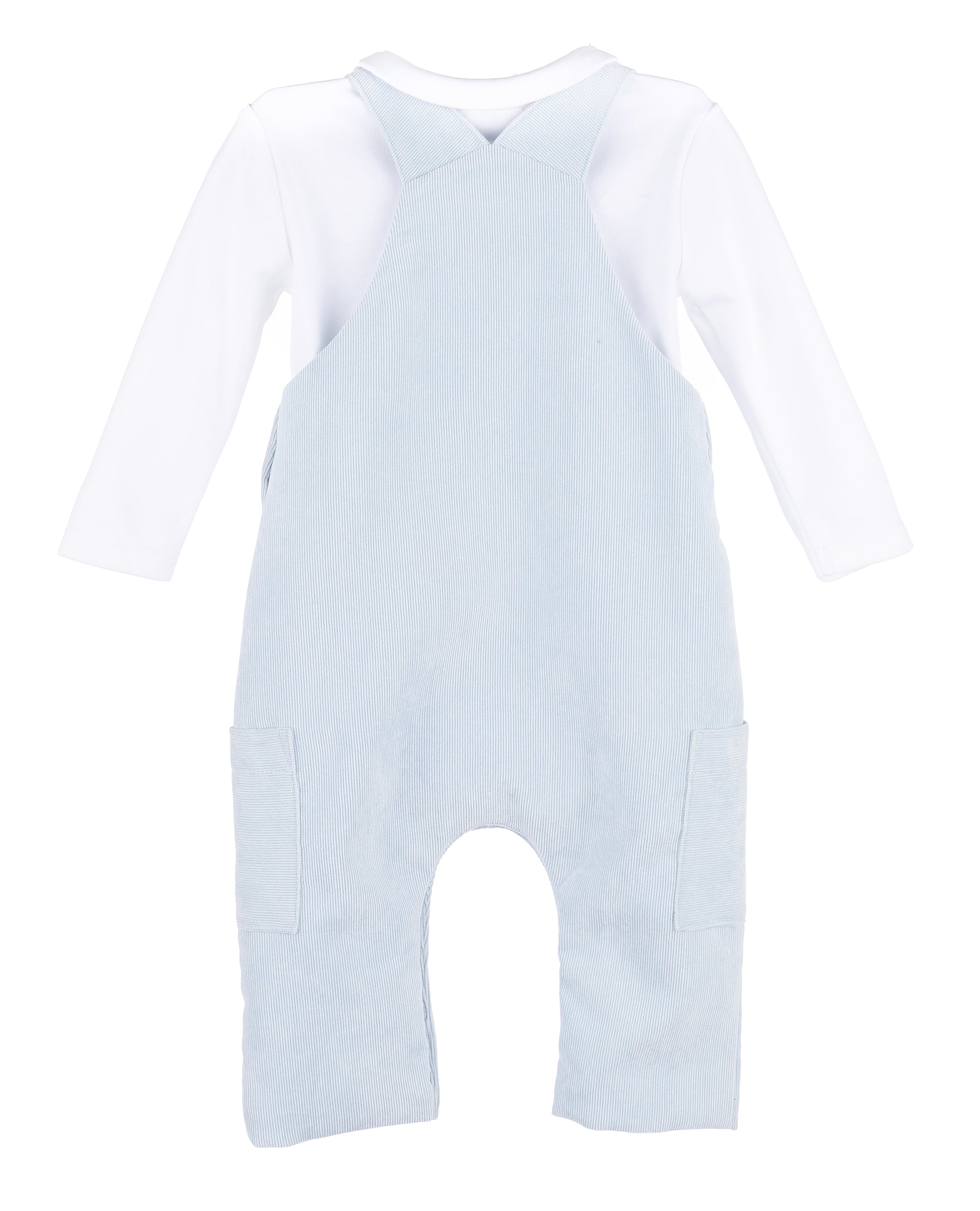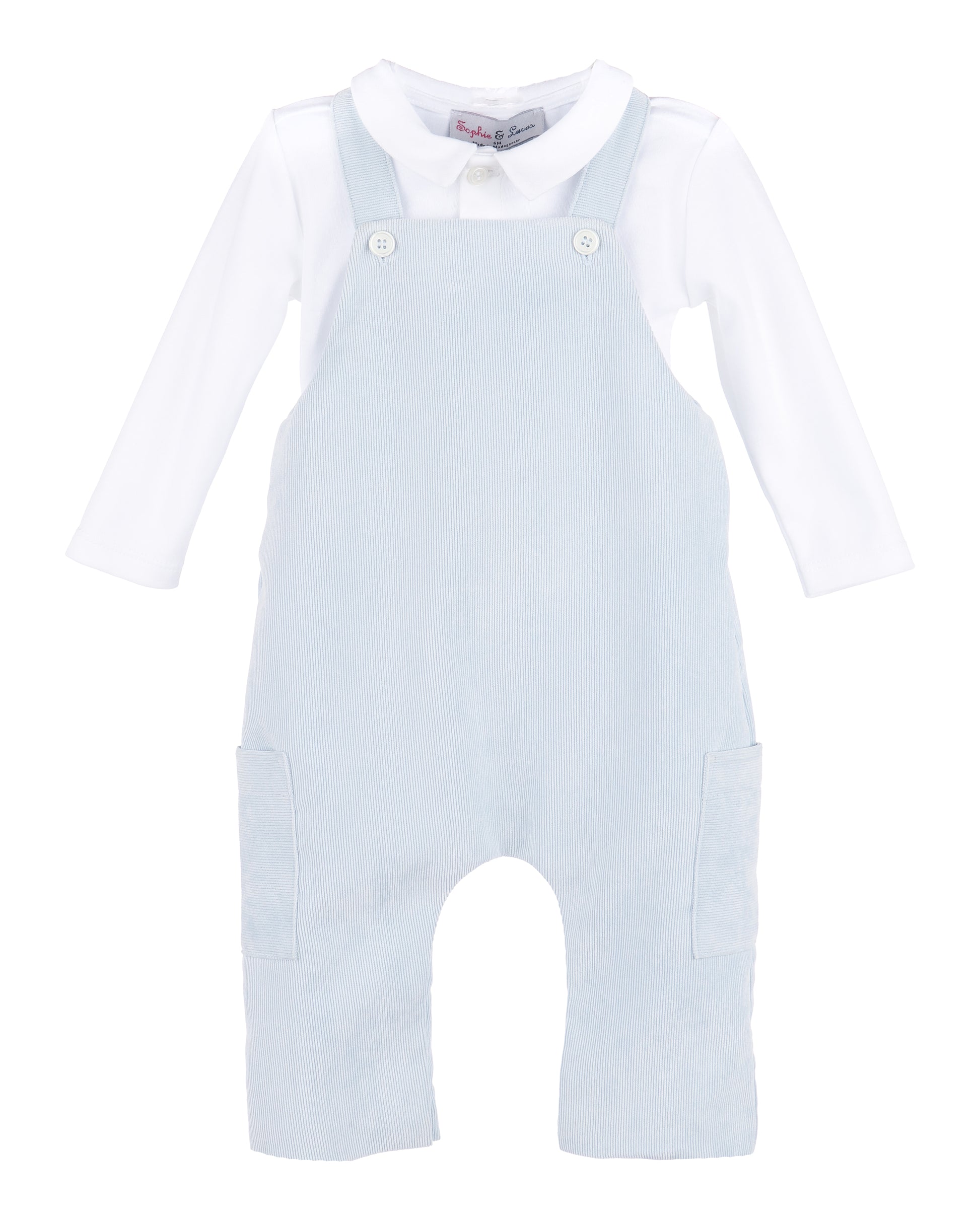 This soft blue fine wale corduroy overall paired with a coordinating white shirt offers timeless style and exceptional comfort. Designed with convenient snaps at the legs, this set ensures easy dressing and changing, making it a refined choice for your little one’s wardrobe.