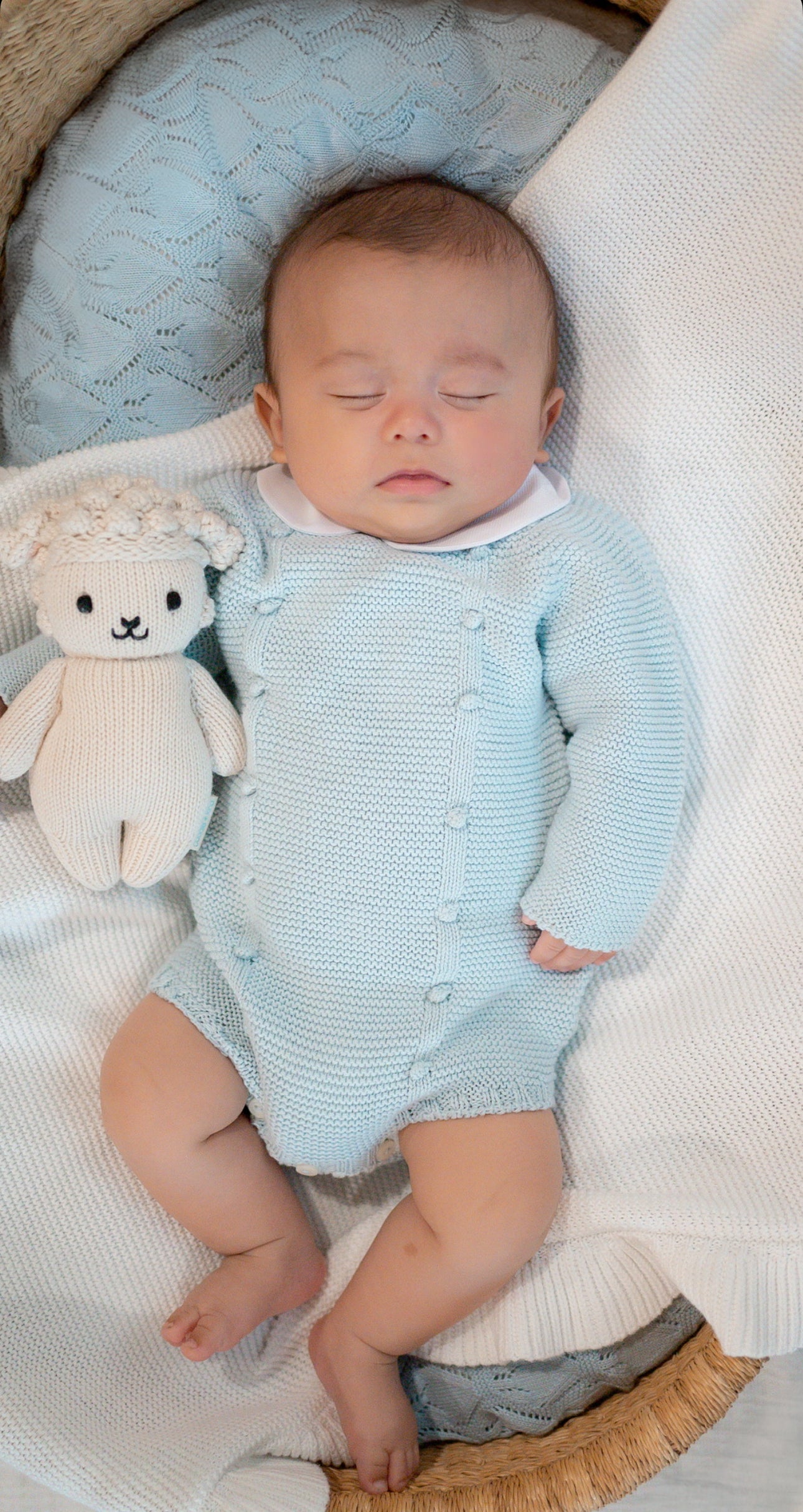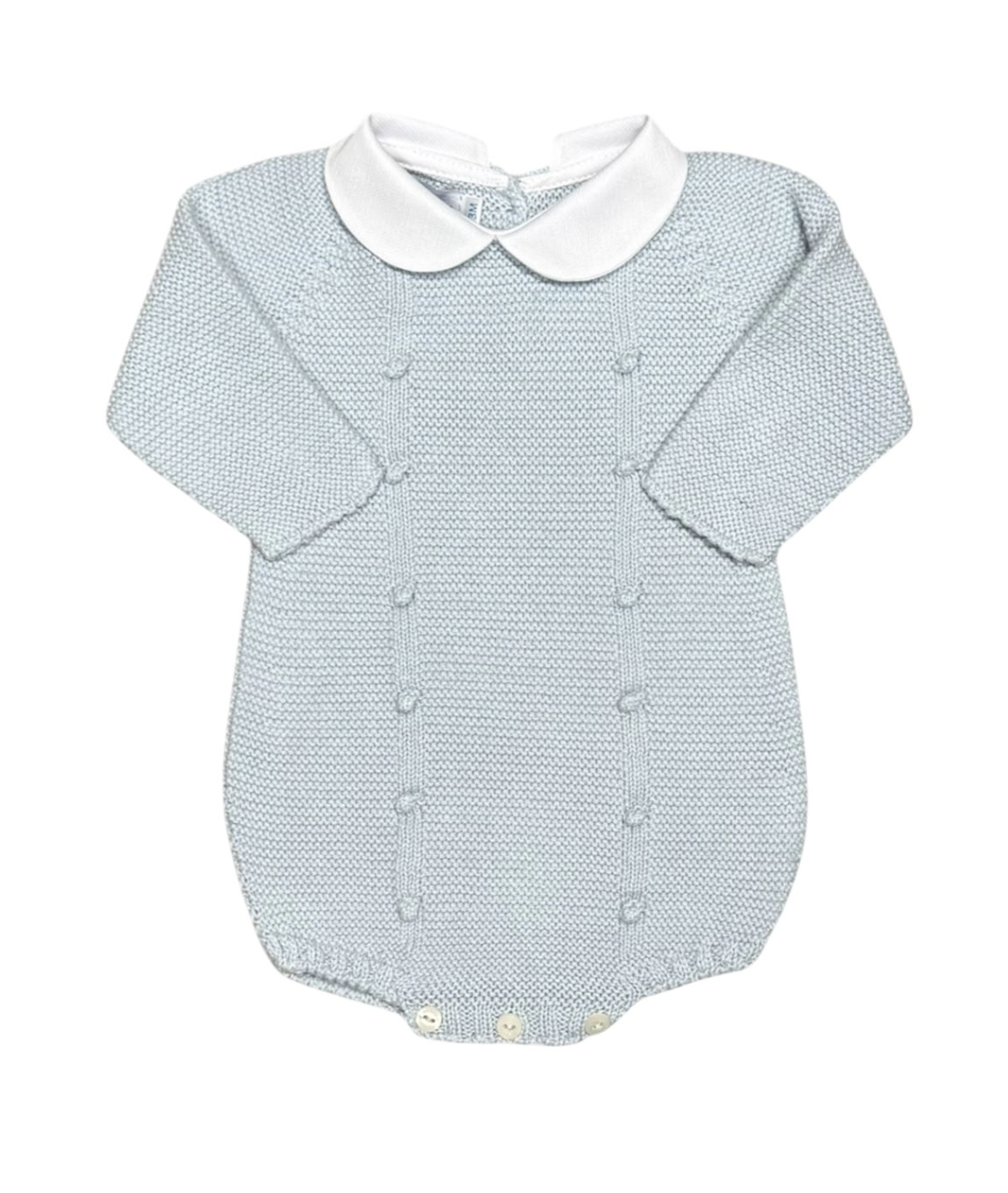 Handcrafted with care, this charming bubble features delicate baubles scattered across soft knit fabric, paired with a crisp white Peter Pan pique collar for timeless elegance. The long sleeves provide gentle coverage, making it perfect for layering or wearing solo. A playful twist on a classic silhouette that brings personality to any little one's wardrobe.