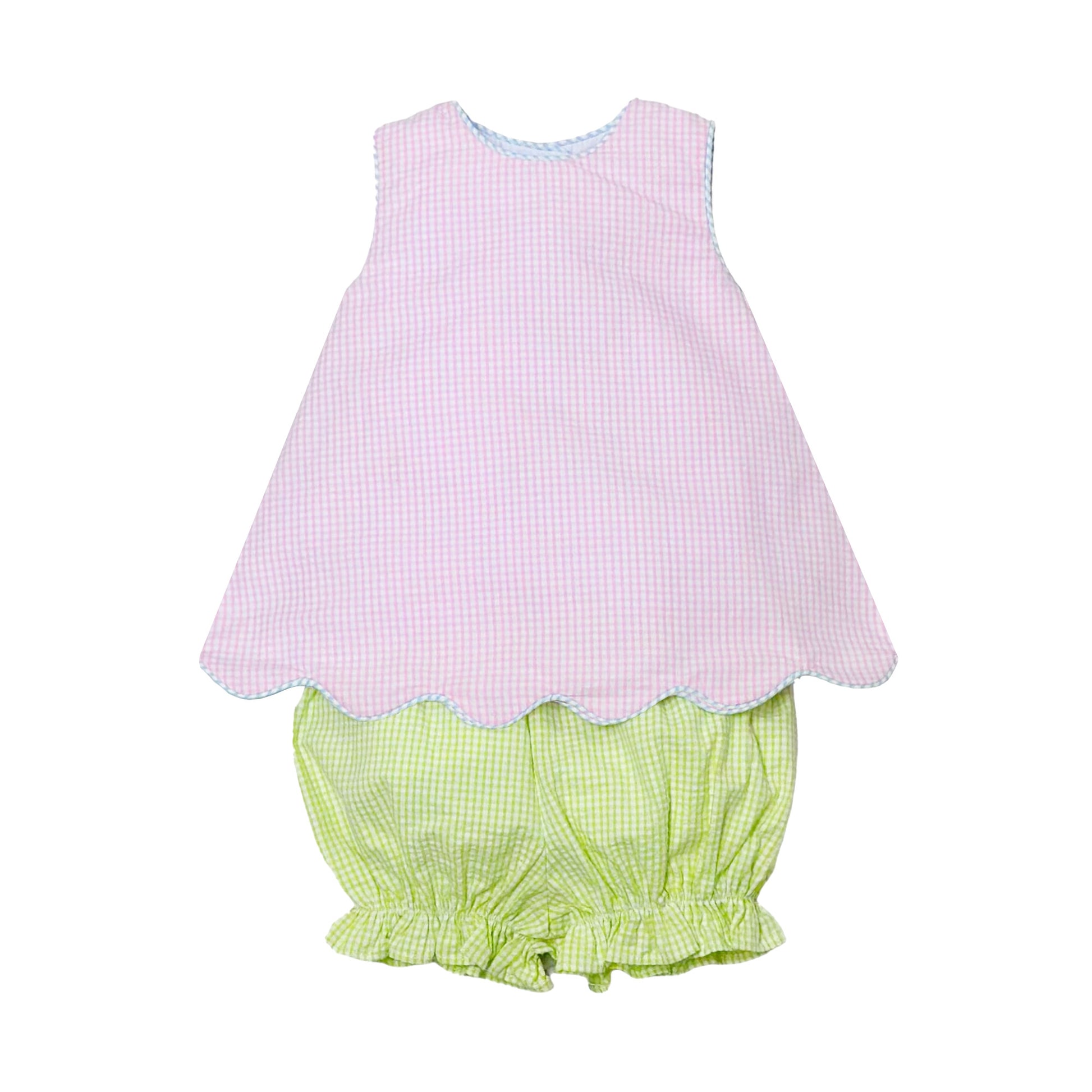 A colorful bloomer set that is perfect for warmer weather. This two piece set includes an A-line shaped sleeveless top in light pink mini check seersucker with a scalloped edge at the bottom, fabric covered buttons down the back, and a large light blue mini check seersucker bow is sewn at the back. The coordinating bloomers in lime green mini check seersucker have cute ruffles at the bottom.