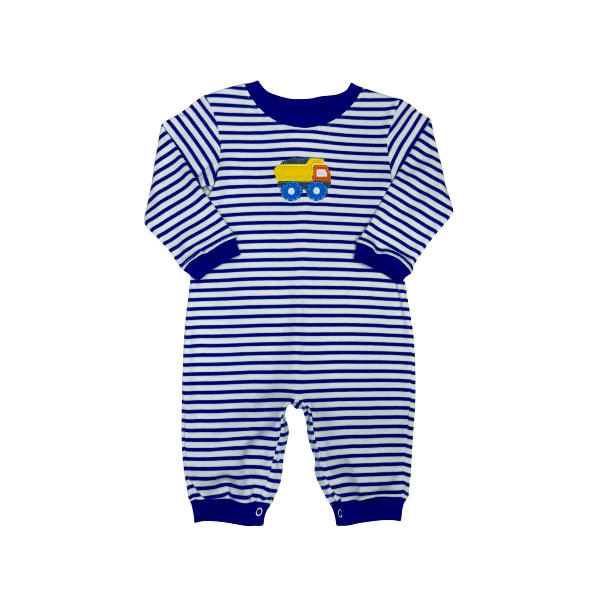 Build big adventures! Our Construction Luke Bubble features two playful smocked construction trucks, perfect for little builders ready to explore. Made from soft periwinkle medium stripe fabric for comfy playtime.