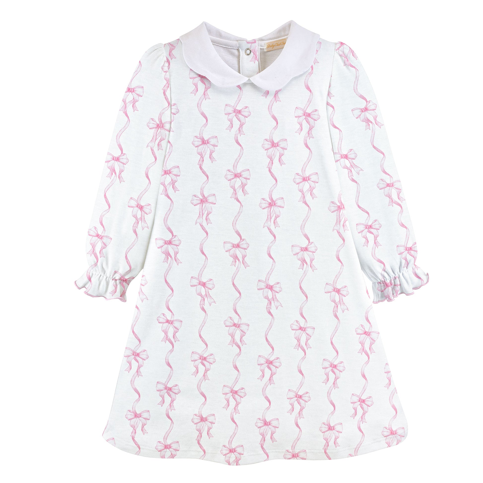 This darling long sleeve dress features a soft pima cotton fabric adorned with playful pink bows and a charming scalloped collar. Perfect for adding a touch of whimsy and comfort to your little one’s wardrobe, it’s ideal for everyday adventures or special occasions.