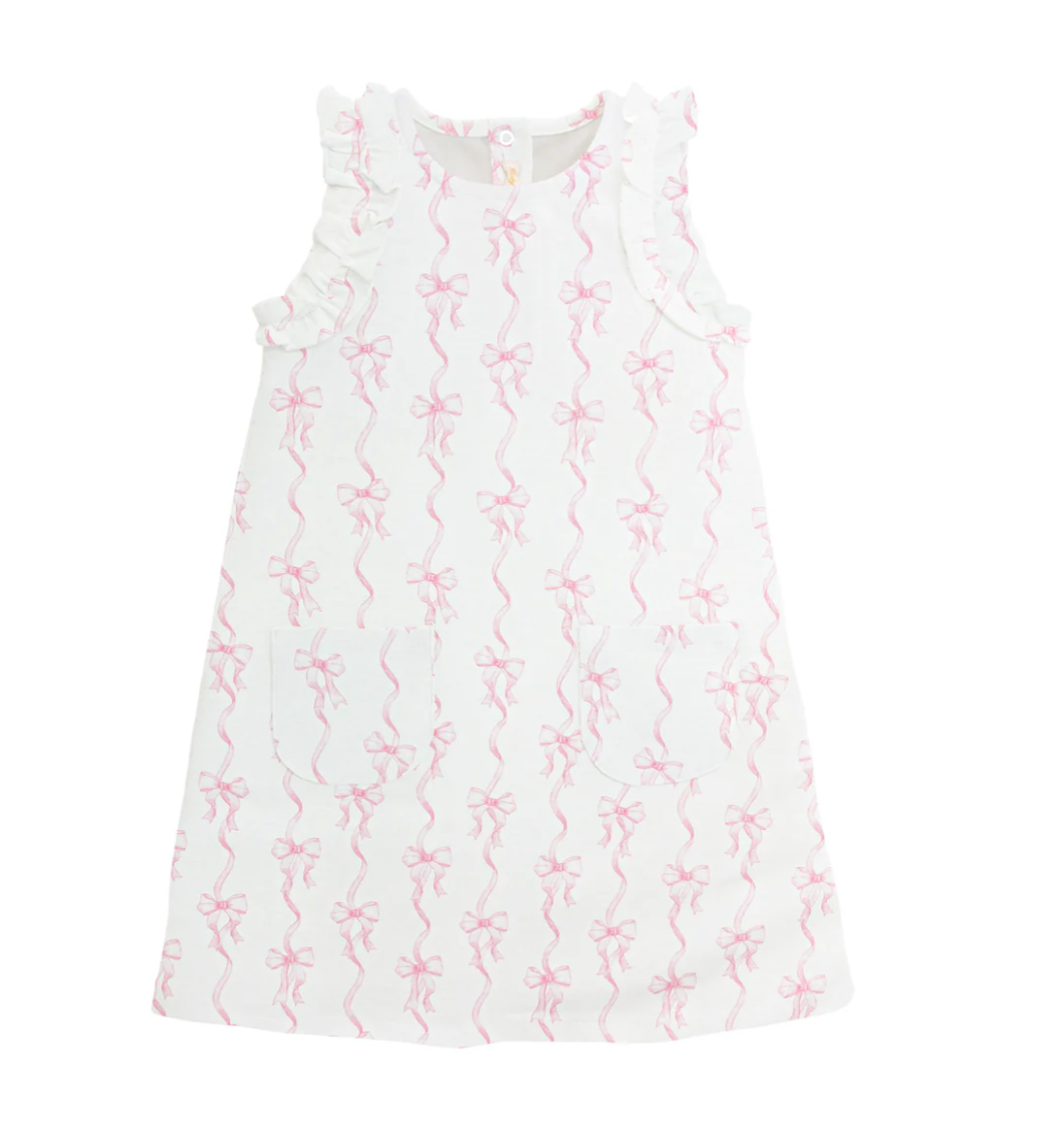 A beautiful pink bows and ribbons watercolor print on an everyday play dress.