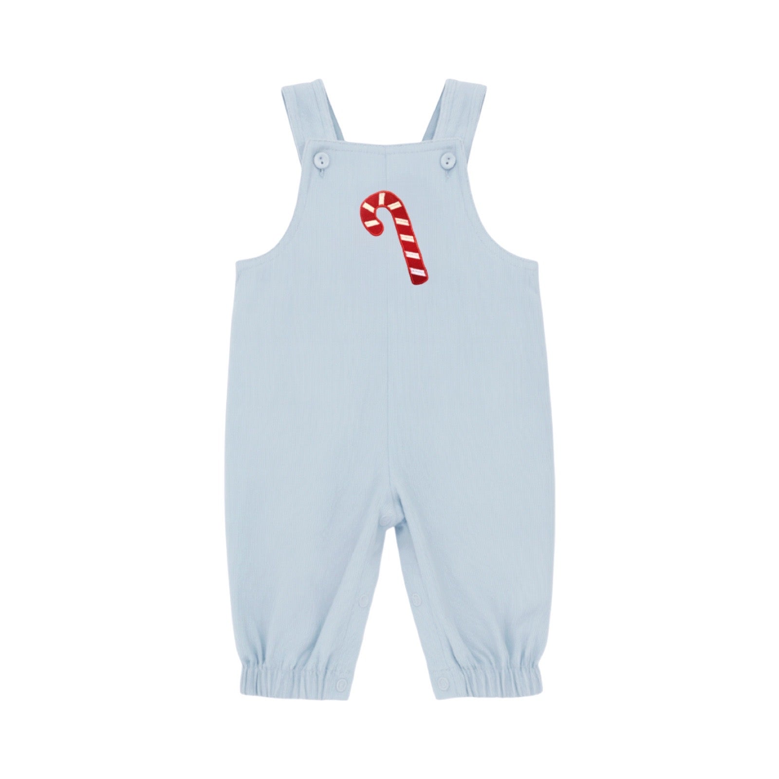 These cozy corduroy overalls bring holiday cheer with a charming candy cane design. Snaps at the legs make diaper changes a breeze, while shoulder buttons simplify dressing. Stretchy elastic cuffs keep the fit snug and comfy as your little guy toddles around. Durable and festive, these overalls are perfect for joyful playtime moments this season.