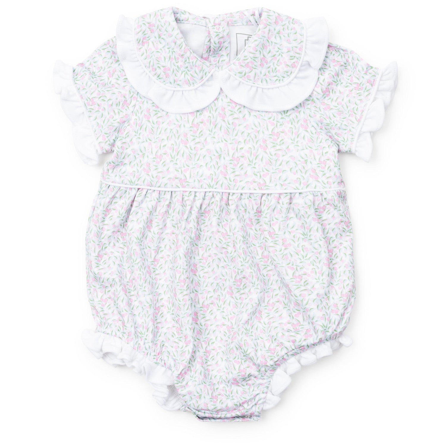 Meet the Council Bubble in Garden Soiree—a charming pima cotton romper that's as delightful as it is practical. This playful piece features an adorable ruffled Peter Pan collar and short sleeves, perfect for little ones who love a touch of vintage-inspired style. The convenient button closure in back paired with three snap closures at the stride makes diaper changes a breeze. Soft, breathable pima cotton keeps her comfortable all day long, whether she's playing in the garden or attending a special occasion.
