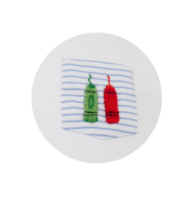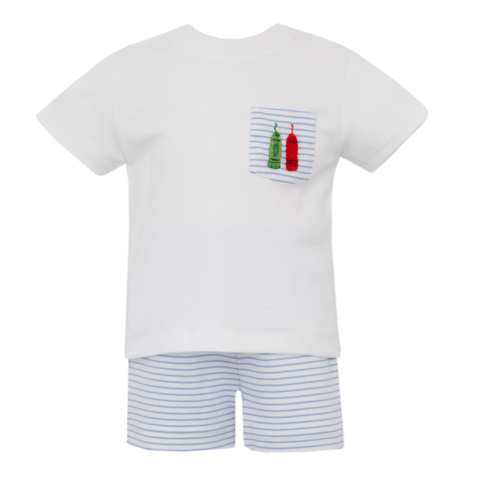 Get ready for back-to-school fun with this playful crochet crayon set! It features cozy blue stripe shorts with a handy pocket, perfectly paired with a soft knit top. This cheerful outfit combines comfort and style, making it ideal for little ones eager to learn and play all day long.