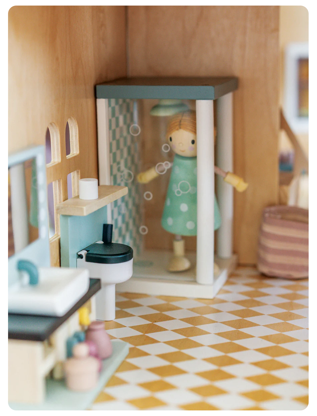 An ultra stylish bathroom set, with sink unit, bathtub, bath tray with book, shower unit, toilet, with toilet rolls, bath mat, and laundry bag. Suitable for all the wooden dolls houses, as scaled to 1:12