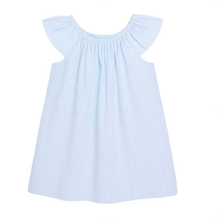 This blouse has adorable, girly details. Light blue mini check seersucker material with ruffled angel sleeves and a full and flowy, pleated A-line shape. A simple and sweet top she will wear all summer long!