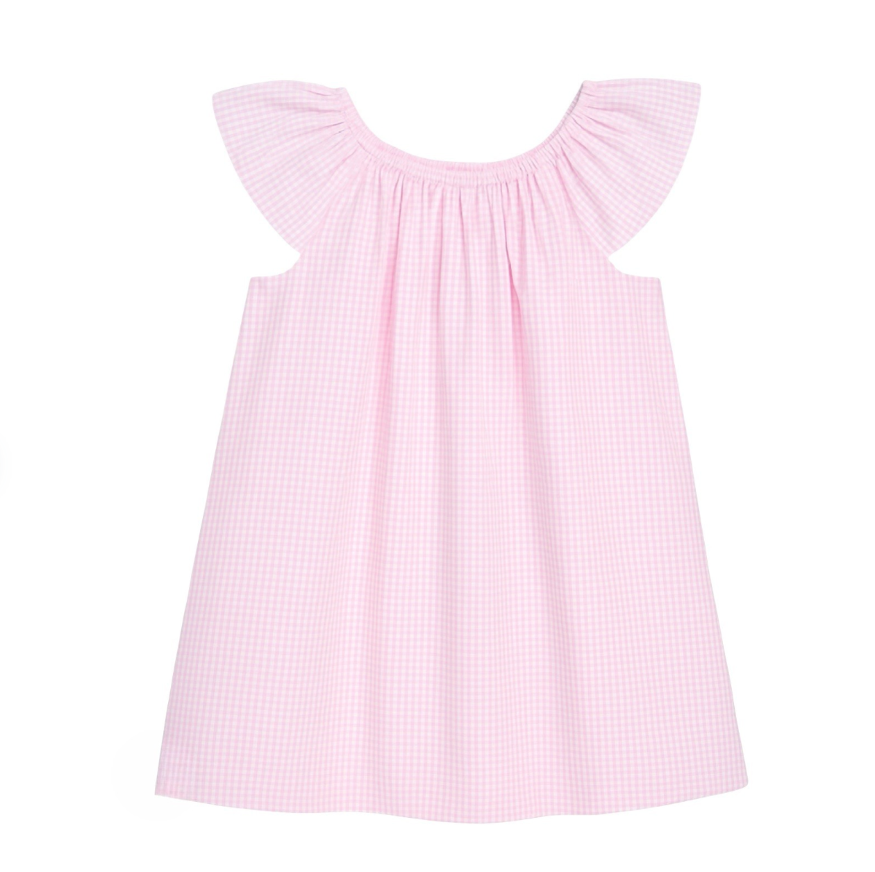 This blouse has adorable, girly details. Light pink mini check seersucker material with ruffled angel sleeves and a full and flowy, pleated A-line shape. A simple and sweet top she will wear all summer long!