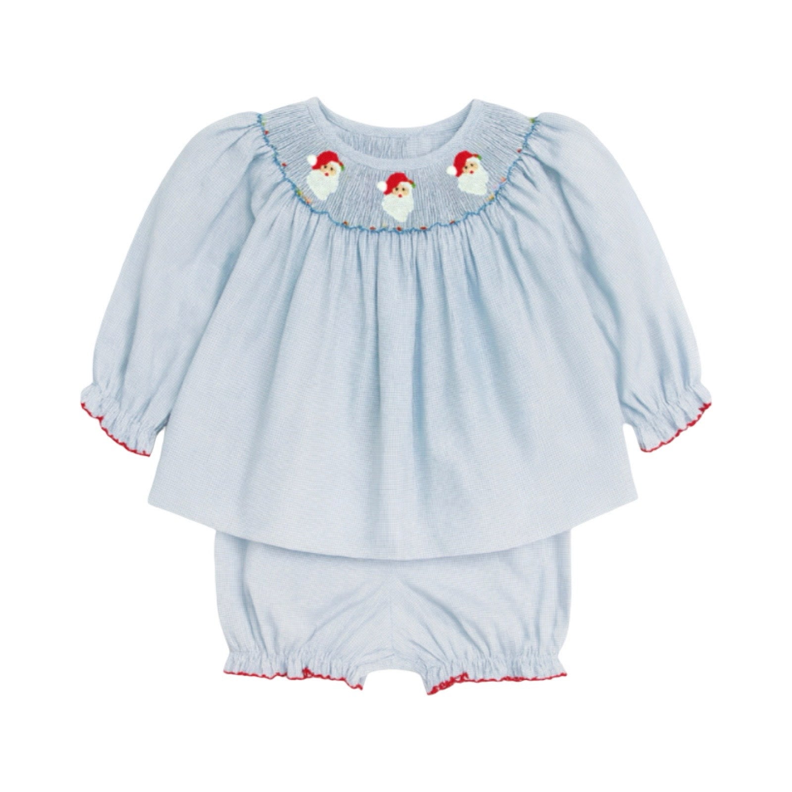 This charming Long Sleeve Emma Bloomer Set features a blue and white gingham woven fabric with playful red picot trim at the sleeves and bloomer edges. The bishop-style top is adorned with adorable smocked Santas, perfectly paired with coordinating bloomers for a festive, whimsical look your little one will love to wear.