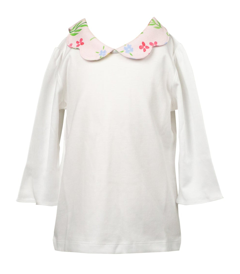 This charming white long-sleeve shirt features a delicate English Garden print on its scalloped collar, adding a touch of whimsy to any outfit. It pairs perfectly with the matching English Garden skirt, creating a fresh, coordinated look ideal for playful days filled with adventure and charm.
