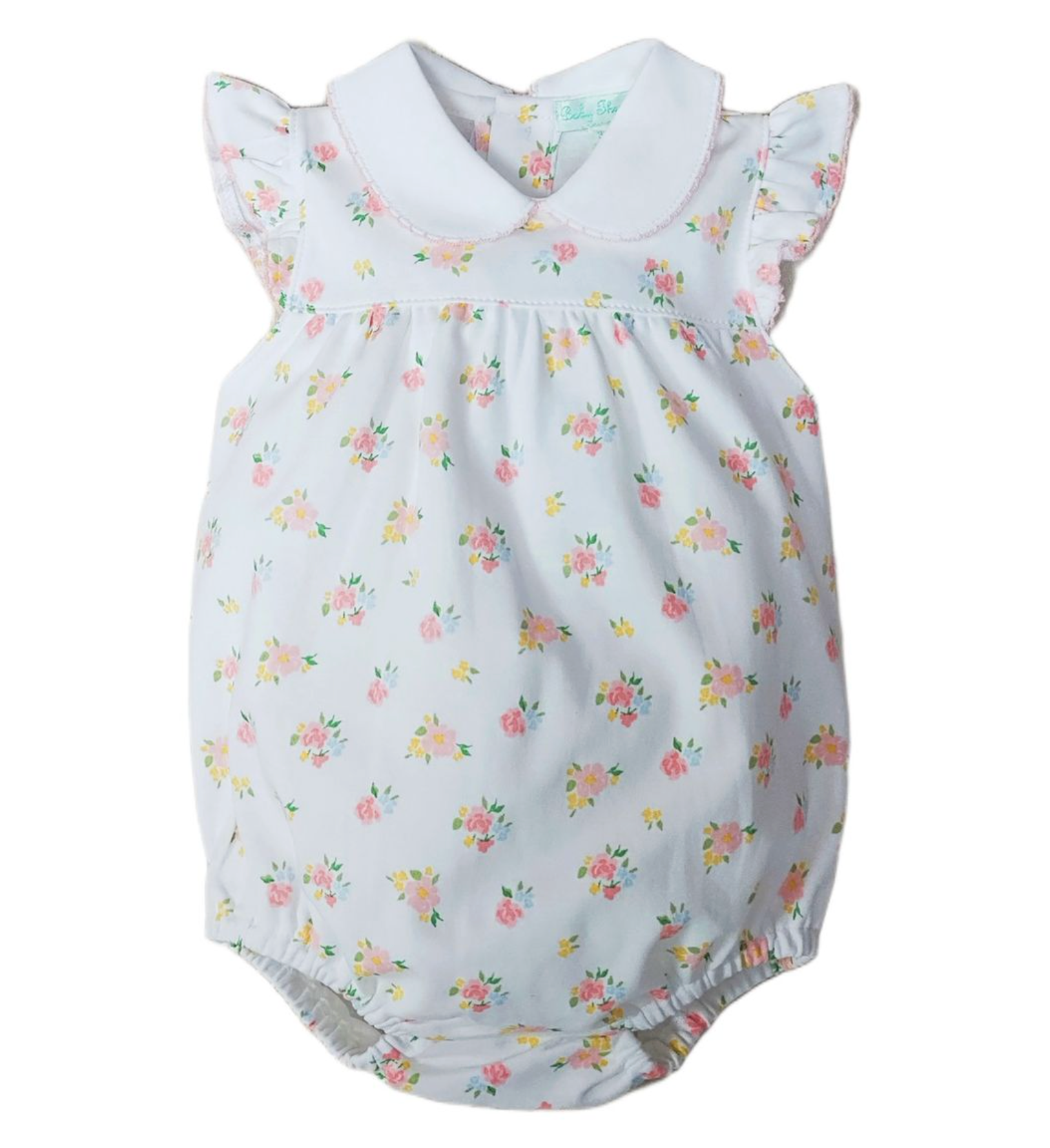 Delicate angel wing flutter sleeves dance with every movement in this charming bubble romper. Soft spring flowers bloom across the fabric, while a crisp white Peter Pan collar adds a timeless, storybook touch. Perfect for special occasions or everyday adventures, this piece combines whimsical details with heirloom-quality construction. A wardrobe essential that celebrates childhood wonder.