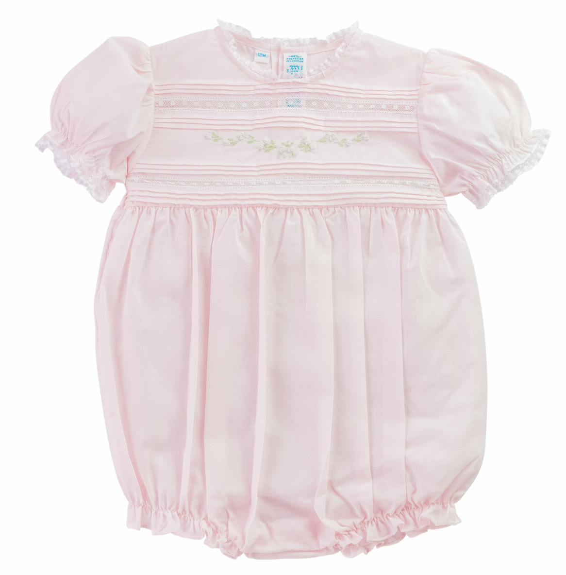 This vintage-style outfit is designed with tons of timeless details: lace trimming, horizontal pintucks, and hand embroidered floral bullions.