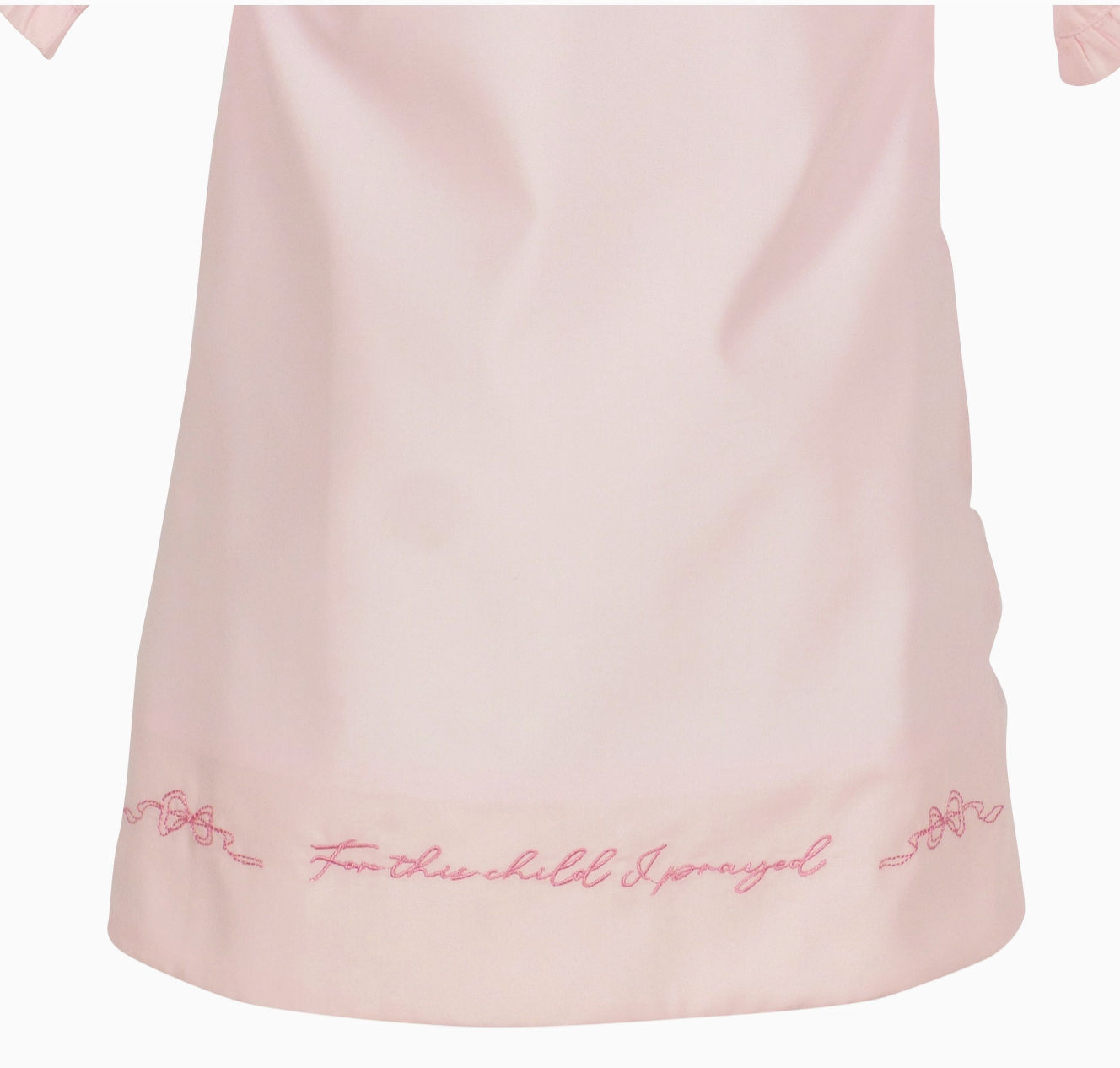 This daygown is an expression of faith and answered prayers. The scripture "For this child I prayed" is embroidered around the hem of this classic broadcloth daygown. Delicate embroideries, ruffles, ribbons and mother of pearl button closures go down the front, fully lined.