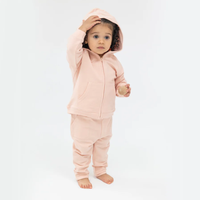 This two piece set includes a full zip hoodie and matching elastic drawstring waistband jogger sweatpants. Pockets on both the hoodie and the joggers.