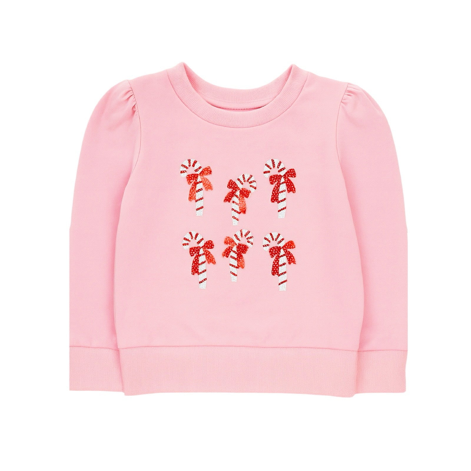 A fun top for your girl to feel festive while looking stylish and cute. This long sleeve pink top features red and white sequin candy canes and red sequin bows. Gathered fabric at the shoulders created puffed sleeves.