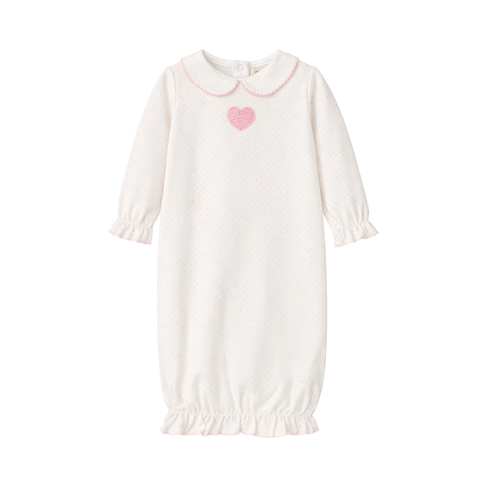 This precious sack gown provides an unforgettable look for every new baby girl. Featuring a baby pink polka dot pattern background with an adorable crochet heart on the chest. This darling gown has a Peter Pan style collar with light pink picot trim and is finished off with a gathered elastic ruffle on the wrists and bottom hem.