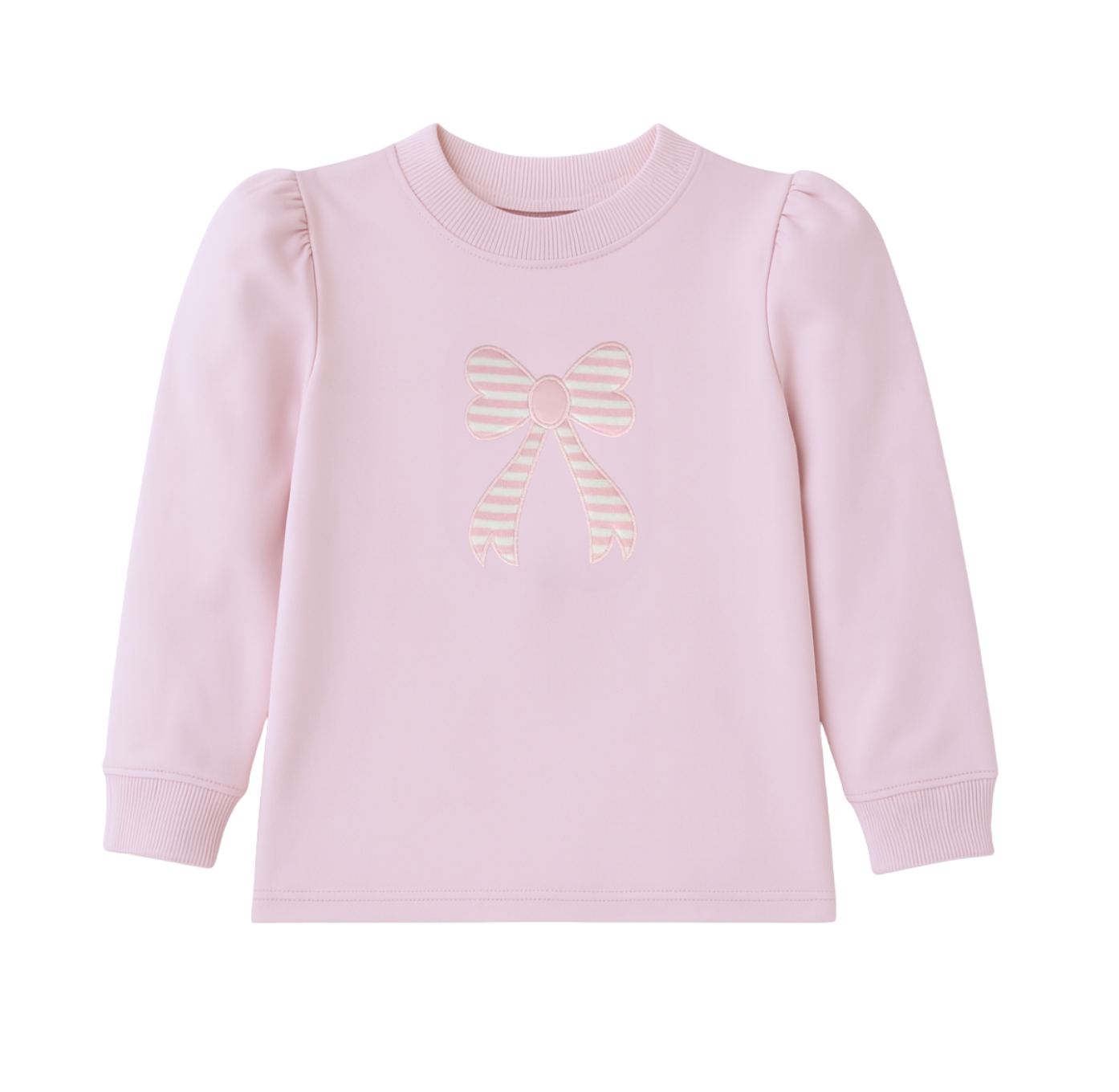 Keep the chill at bay in this cozy light pink fleece sweatshirt! This warm long sleeve sweatshirt features a light pink and white striped bow applique, puffed sleeves and a ribbed cuff finish around the neck and wrists. The straight bottom hem has slits on each side that offers ease of movement for your active girl. Warm, soft, and oh-so-wonderful.